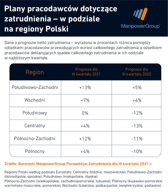Najbardziej sprzyjające znalezieniu nowej pracy warunki czekają na mieszkańców regionu południowo-zachodniego (+13 proc.), gdzie prognoza jest najwyższa od dwóch lat oraz północno-zachodniego (+12 proc.). Najmniej optymistyczni w swoich planach rekrutacyjnych są pracodawcy z południowej Polski.