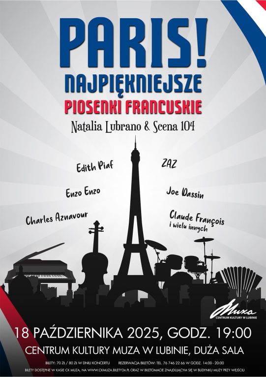 Natalia Lubrano z zespołem Scena 104 zaprezentuje utwory takich artystów, jak: Edith Piaf, Charles Aznavour, Enzo Enzo, Joe Dassin, ZAZ czy Claude François.
