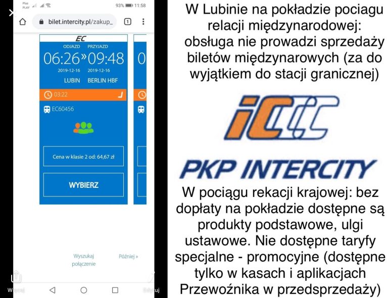 Wielu naszych Czytelników pyta o możliwość zakupu biletów na wspomniane trasy. W Lubinie PKP Intercity nie posiada bowiem ani kasy własnej ani też agencyjnej, a stojący na dworcu biletomat należy do Kolei Dolnośląskich, zatem nie dostaniemy w nim biletów zagranicznych.