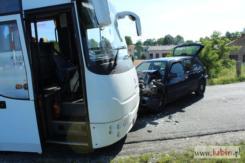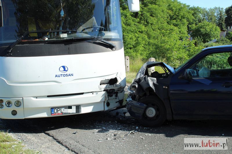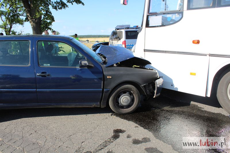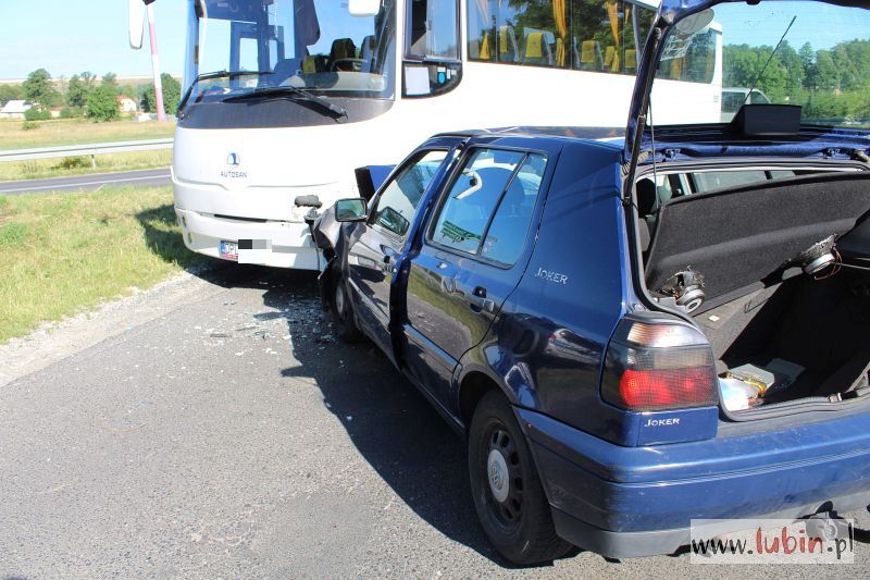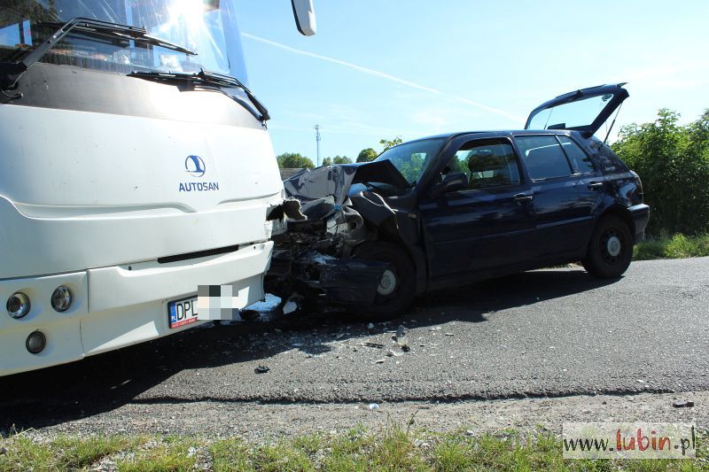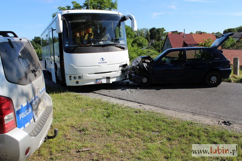 – Na łuku drogi 19-letni kierujący volkswagenem golfem zjechał na przeciwległy pas ruchu i zderzył się z autobusem. Zdarzenie zostało zakwalifikowane jako kolizja. Kierowca golfa został ukarany 500-złotowym mandatem karnym i sześcioma punktami karnymi – mówi aspirant sztabowy Jan Pociecha, rzecznik lubińskiej policji.