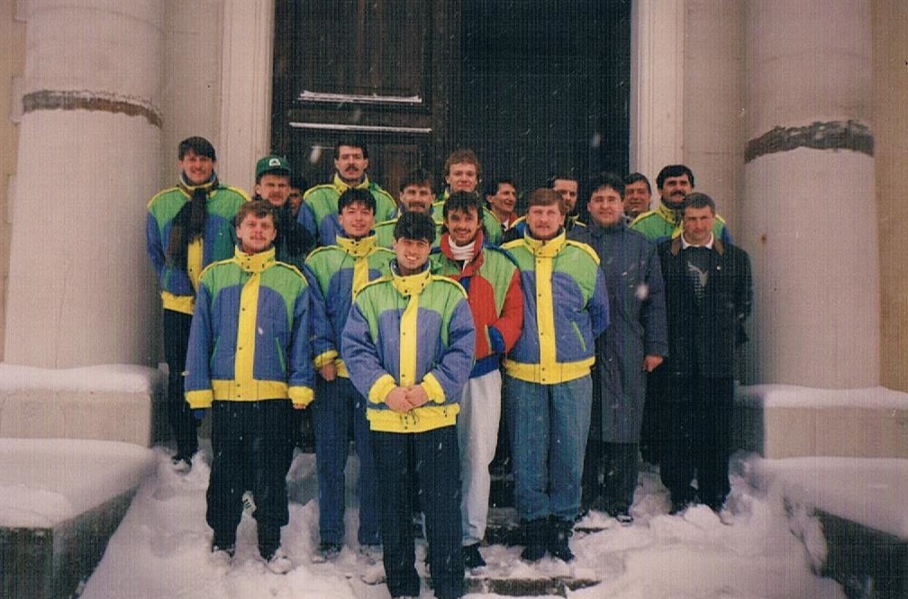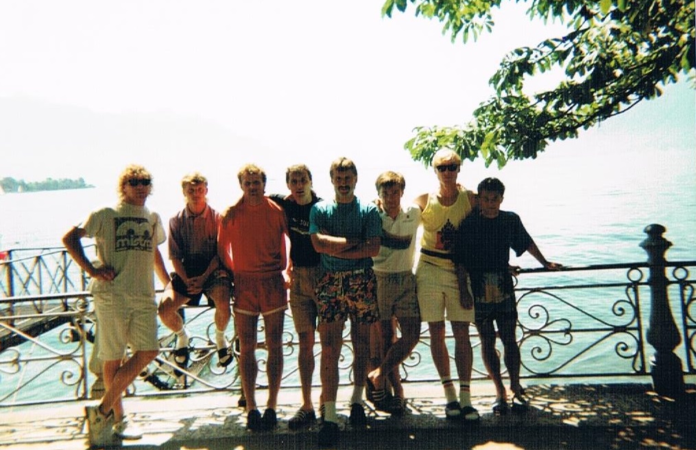 Lozanna, rok 1991 przed meczem Puchar Intertoto. Od lewej stoją: Jędrzej Kędziora, Zbyszek Szewczyk, Stefan Machaj, Mariusz Olbiński, Krzysiu Koszarski, Grzesiu Pyc, Darek Lewandowski i Darek Baziuk