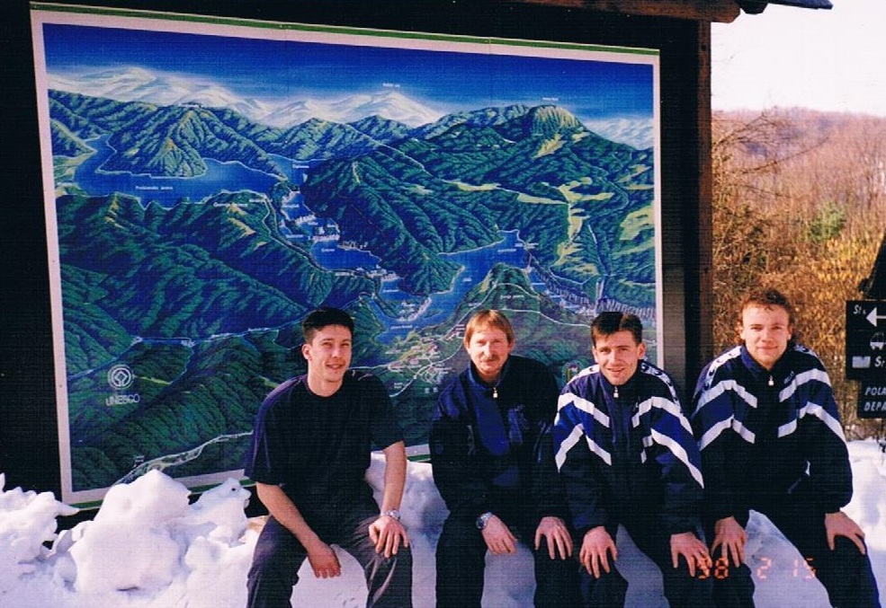 Obóz przygotowawczy w Chorwacji w 1998 roku. Na zdjęciu od prawej Jędrzej Kędziora, Radosław Jasiński, trener Andrzej Szarmach i fizjoterapeuta Sławek Kardasz.