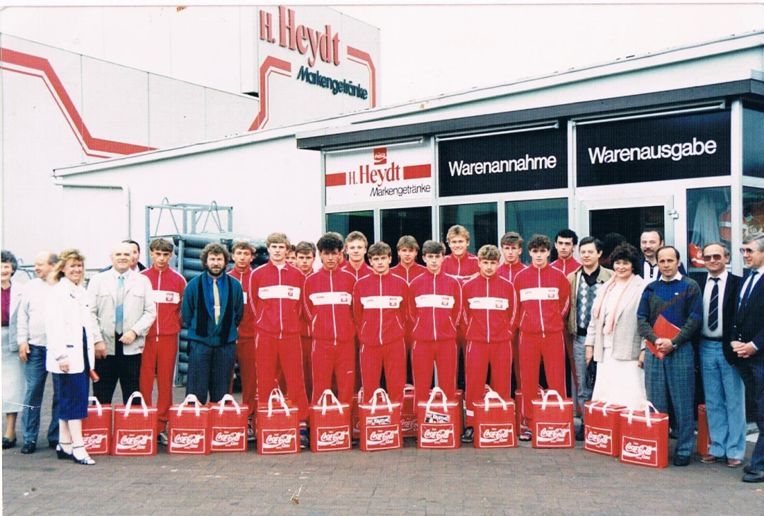 Rok 1987. Reprezentacja Polski Juniorów z Jędrzejem Kędziorą w drodze na turniej do Belgii. Wizyta w fabryce Coca Coli w niemieckim Osnabrück.