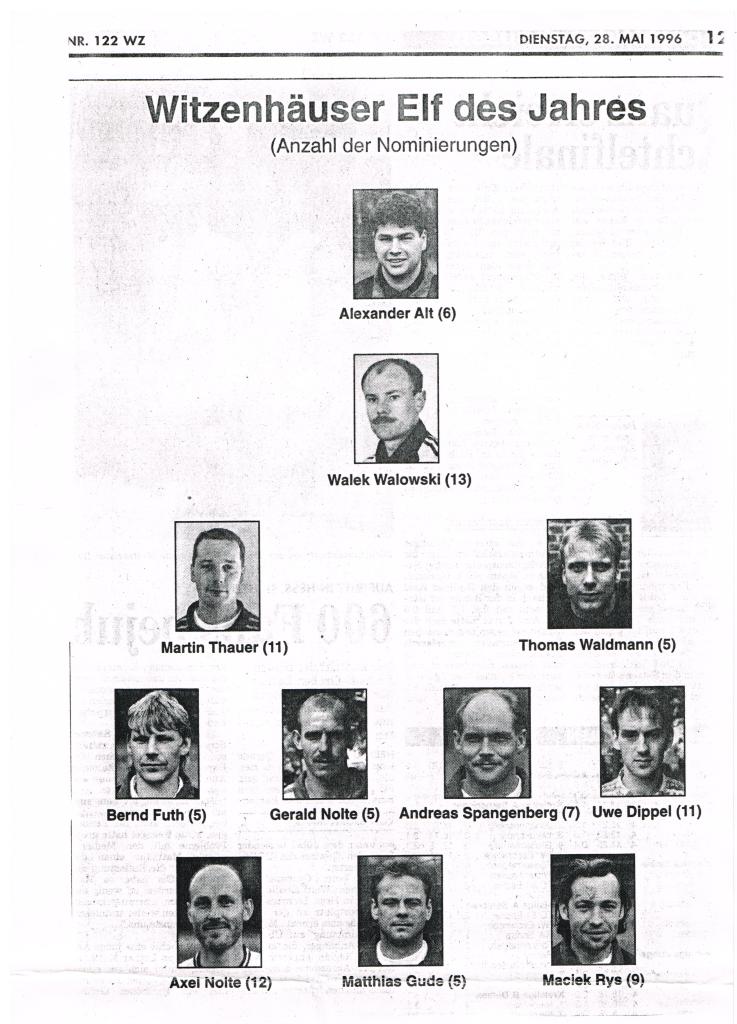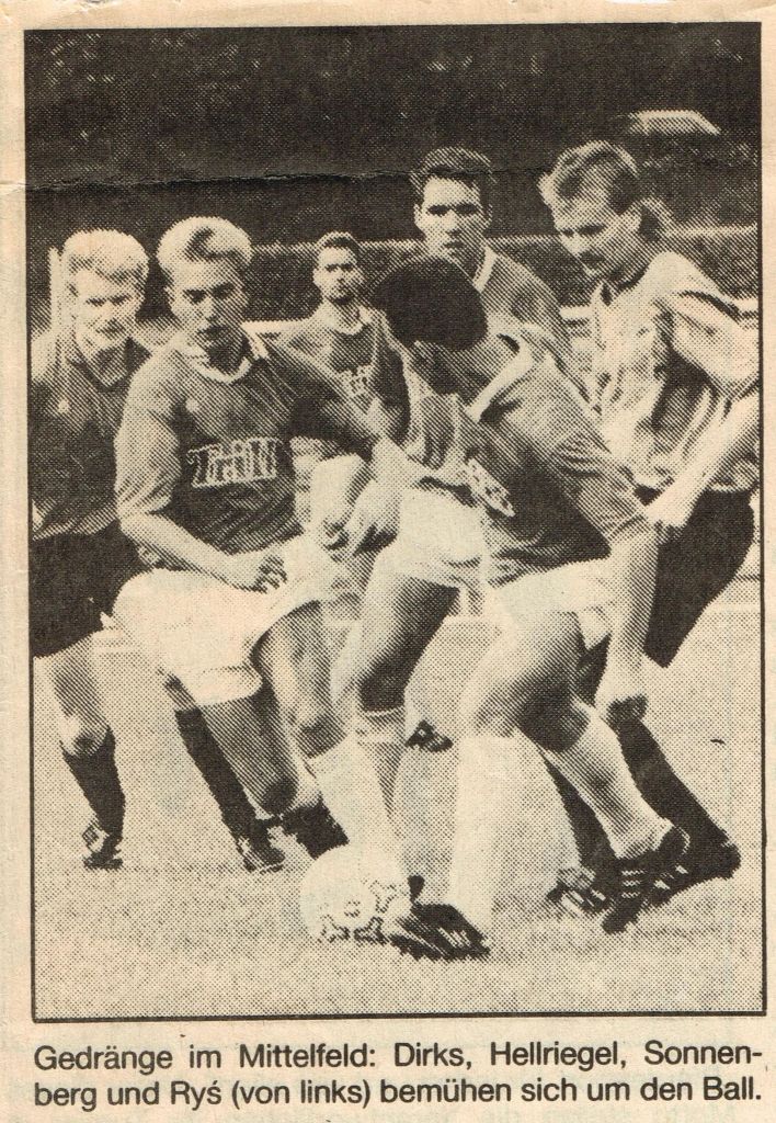 Maciej Ryś: Grałem w TSV Verden w 1992 roku. W TuS Bruchmühlen grałem w Landeslidze. Moim trenerem był Friedel Jentsch. W sezonie 1994/1995 strzeliłem 8 bramek i byłem najskuteczniejszym strzelcem drużyny. Ze Sławkiem Wałowskim i Januszem Najdkiem grałem w FC Grossalmerode w Bezirklidze w sezonie 1995/1996. Trochę bramek tam nastrzelałem. Zagłębie Lubin i FC Grossalmerode utrzymywały przyjazne stosunki i wielu lubińskich zawodników zakotwiczyło lub miało epizod w tym klubie. Od sezonu 1996/1997 wspólnie ze Sławkiem Wałowskim występowałem w Teutonia Altstadt Bielefeld. To była Kreisliga A, a naszym trenerem był Bernd Mönkemann. W 1998 roku doszło do zmiany trenera i nowym szkoleniowcem został Arno Hornberg. Muszę tutaj wspomnieć o wspaniałym człowieku, Manfredzie Wulfmeierze, który był sponsorem drużyny i nie mogliśmy na nic narzekać. Jako ciekawostkę dodam, że w 1998 roku rozegraliśmy sparing z MKS Karolina Jaworzyna Śląska ze względu na współpracę polsko-niemiecką miast. Jak pewnie większość wie, Sławek Wałowski pochodzi z Jaworzyny Śląskiej.