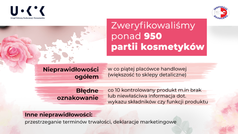 Inspekcja Handlowa zbadała w II i IV kwartale 2020 r. rynek kosmetyków – ich oznakowanie – czyli czy konsumenci otrzymują niezbędne informacje w języku polskim, prawidłowość obrotu tzn. czy na opakowaniu w wykazie składników nie znajdują się takie, które są niedozwolone, oraz czy informacja producenta typu „lśniące włosy” ma rzeczywiste „pokrycie” w dokumentacji i odpowiednich badaniach.