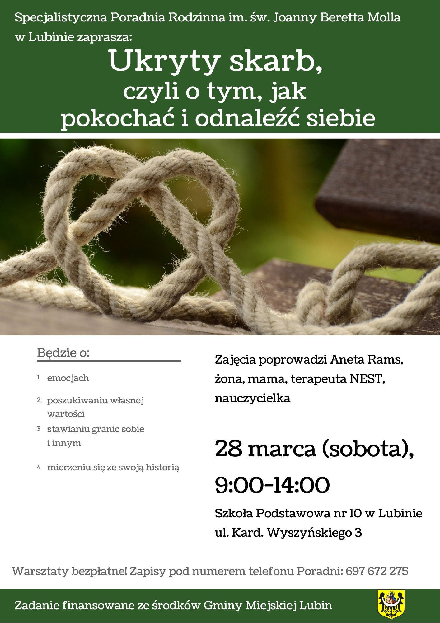 Będzie między innymi o emocjach i poszukiwaniu własnej wartości – Specjalistyczna Poradnia Rodzinna im. św. Joanny Beretta Molla w Lubinie kolejne warsztaty kieruje do dorosłych. Zajęcia „Ukryty skarb – czyli o tym, jak pokochać siebie” odbędą się 28 marca.