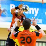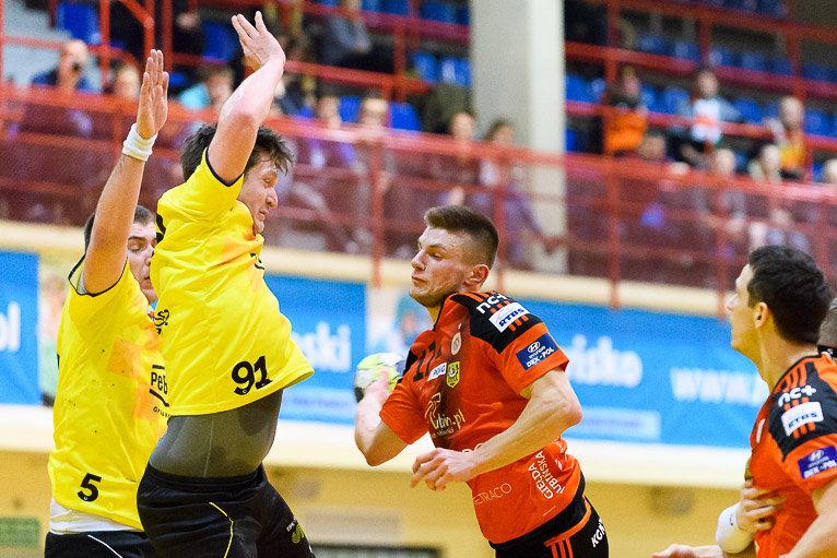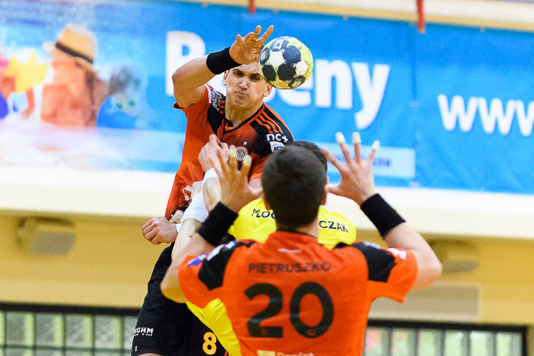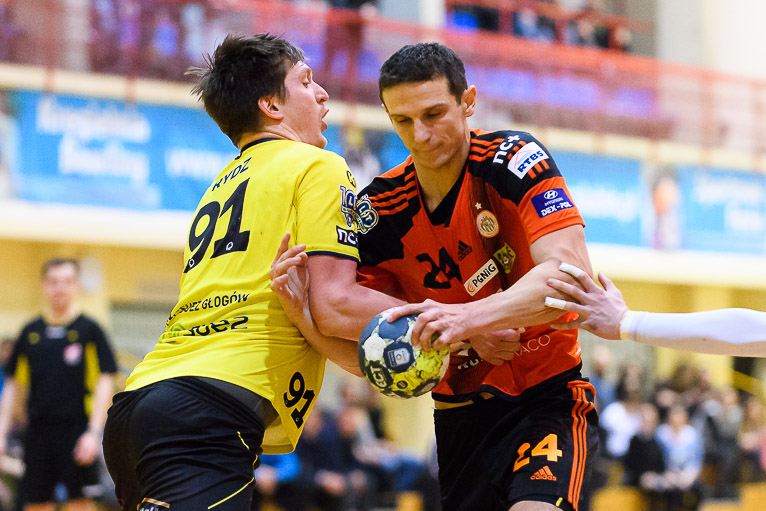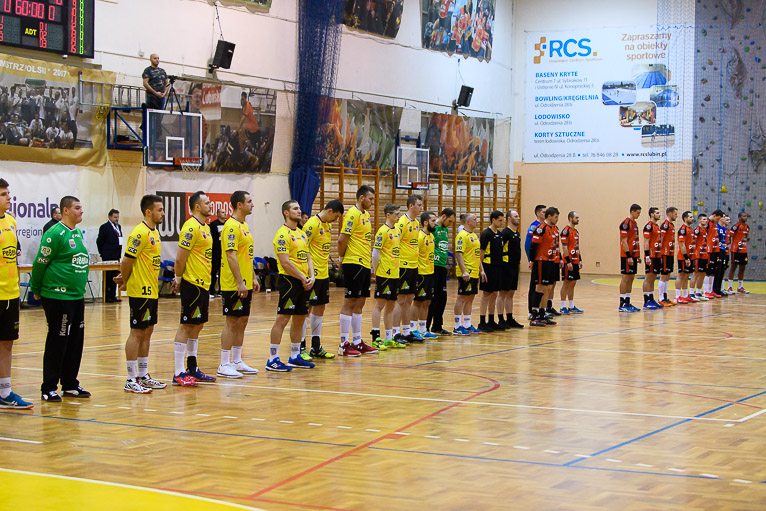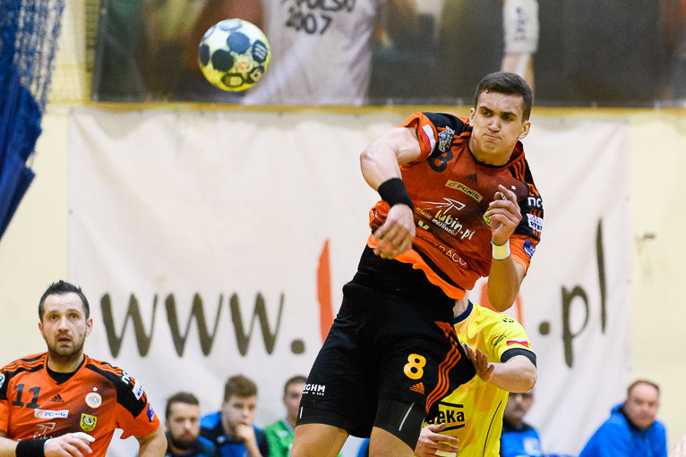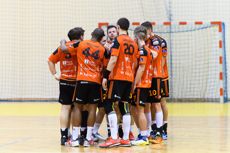 Do jedenastej minuty trwała wymiana ciosów i walka bramka za bramkę. Udane interwencje Jakuba Skrzyniarza oraz dobra gra z kołem i bramki Tomasza Pietruszki sprawiły, że miedziowi odskoczyli na trzy bramki – 8:5 po kwadransie gry.  Trzybramkowa przewaga utrzymywała się przez kolejne dziesięć minut, było nawet 14:10, aż w końcu do głosu doszli goście. Głogowianie rzucili trzy bramki z rzędu i zrobiło się 14:13. Ostatnie trzy minuty to znów przewaga gospodarzy, kolejne bramki Arkadiusza Moryto i do przerwy było 17:14.