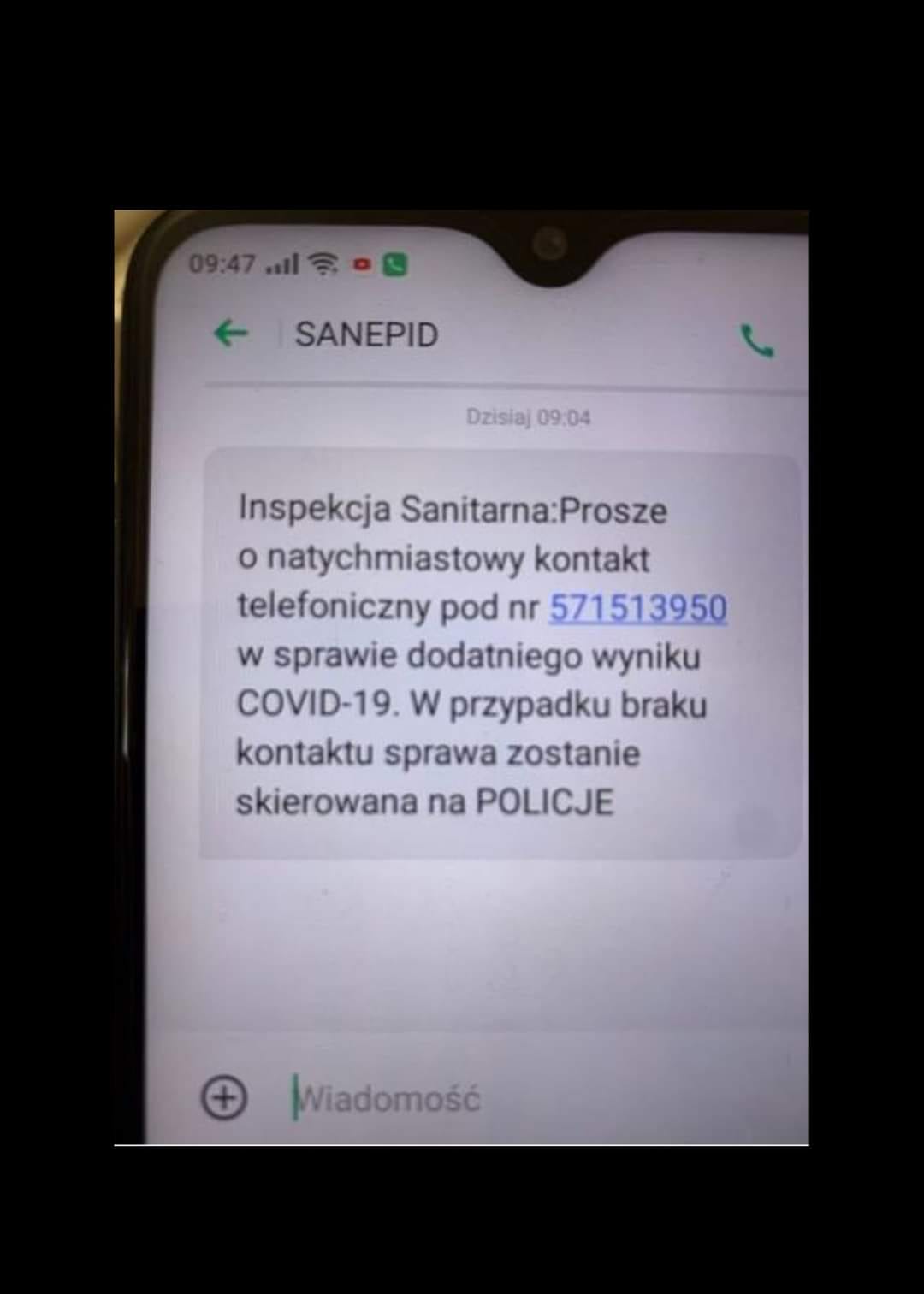 „Inspekcja Sanitarna: Proszę o natychmiastowy kontakt telefoniczny pod numerem 571513950 w sprawie dodatniego wyniku COVID-19. W przypadku braku kontaktu sprawa zostanie skierowana na POLICJĘ” – czytamy w treści SMS-a.