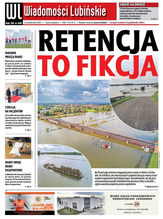 Wiodącym tematem nowego numeru „Wiadomości Lubińskich”, który ukaże się jak zwykle w czwartek, 22 października, jest poważne zagrożenie powodzią. Wystarczyły krótkie, obfite opady deszczu, by poziom wody w Odrze przekroczył pięć metrów. Okazuje się, że retencja, o której tyle się od pewnego czasu mówi, praktycznie nie istnieje.