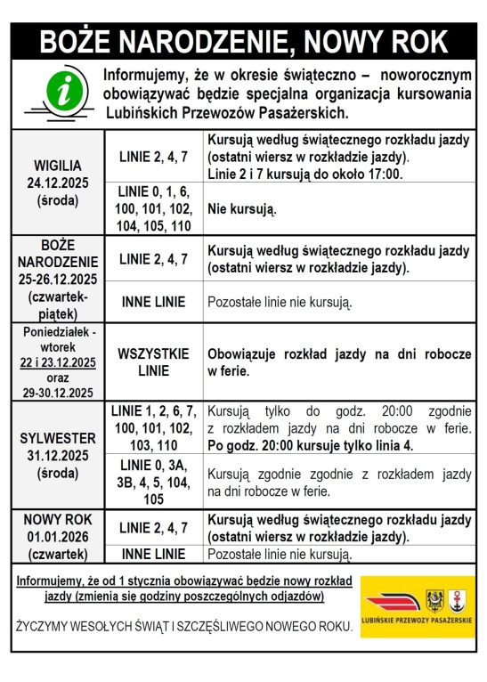 Szczegółowy rozkład można znaleźć na stronie lubińskiego PKS-u oraz w komunikacie poniżej.
