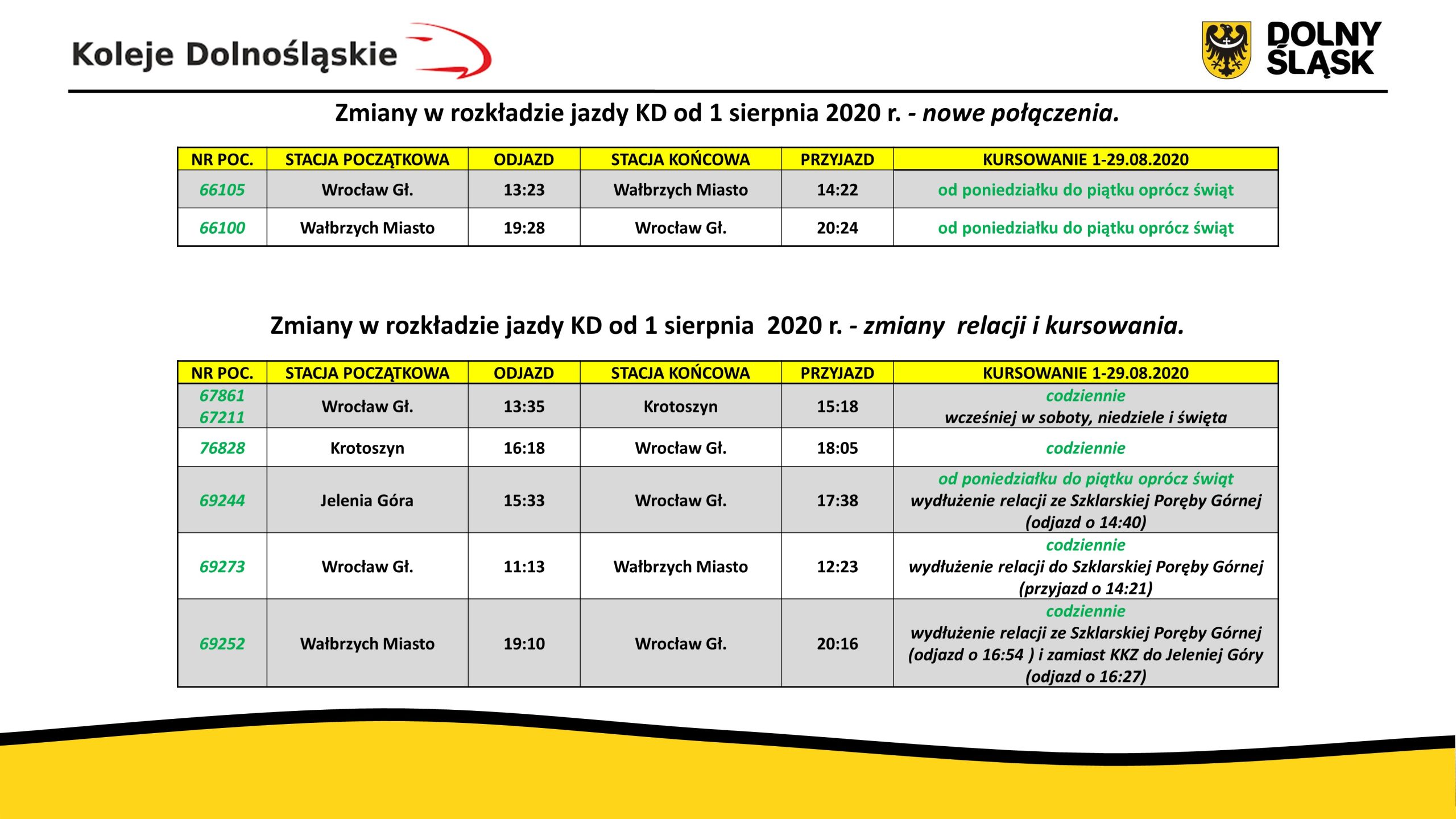 – Mamy świadomość, że Dolnoślązacy oczekują, by pełna siatka połączeń wróciła jak najszybciej, bo wielu osobom cięcia kursów, jakie wymusił na nas koronawirus, wciąż uprzykrzają życie. Uruchamiamy więc kolejne połączenia, bo o ile nie stanęliśmy jeszcze w pełni na nogi, o tyle wsłuchujemy się w głos naszych pasażerów. Chciałbym również zapewnić, że robimy co w naszej mocy, by wszystkie nasze pociągi wróciły na tory jak najszybciej – zapewnia Damian Stawikowski, prezes KD.