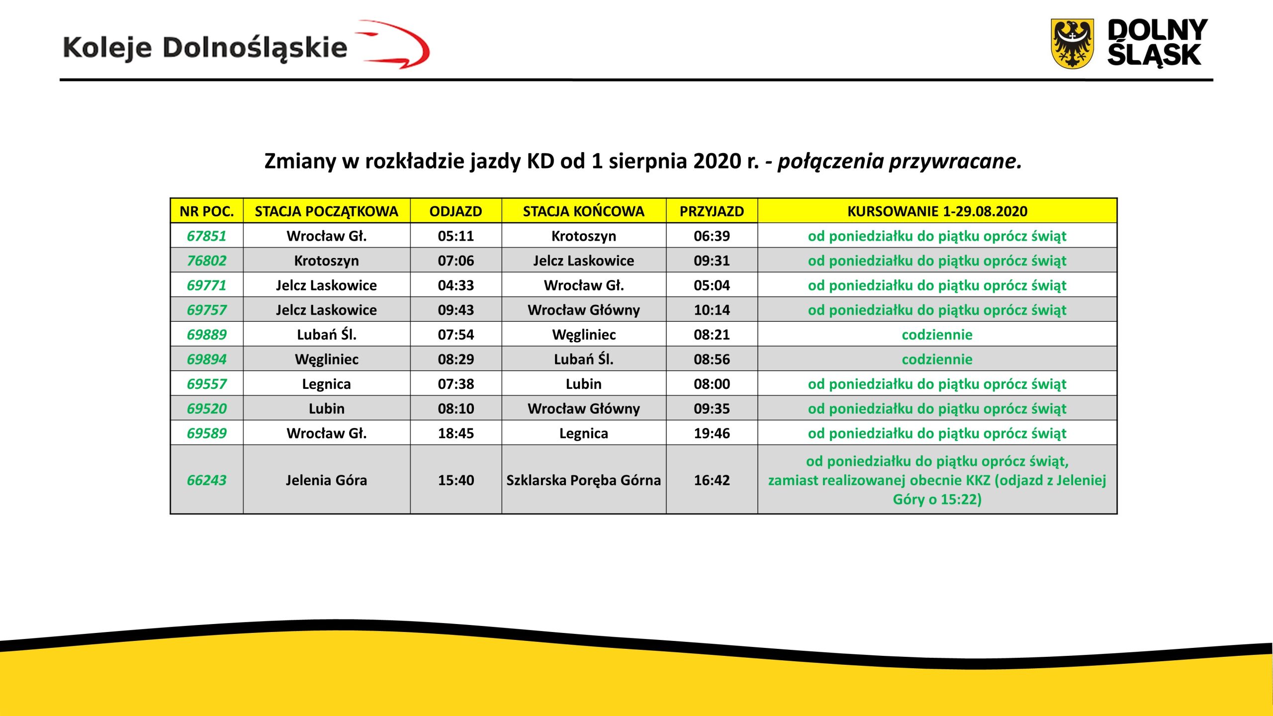 – Pociąg relacji Wrocław Główny – Lubin, kursujący w dni wolne od pracy o godzinie 21.10, jeździł w ramach rozkładu jazdy 2018/2019. Z początkiem grudnia 2019 r., wraz z wprowadzeniem nowego rocznego rozkładu jazdy 2019/2020, połączenie to przestało istnieć. Obecnie nie przewidujemy jego przywrócenia. Decyzja nie ma żadnego związku z odmrażaniem kolejnych połączeń po cięciach spowodowanych koronawirusem, gdyż połączenie to nie funkcjonowało w aktualnym rocznym rozkładzie jazdy – wyjaśnia Bartłomiej Rodak, rzecznik prasowy Kolei Dolnośląskich.