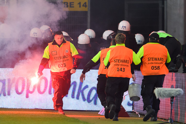 Co do samego meczu to do pewnego momentu przebiegał on dosyć spokojnie. Zanim rozpoczęła się druga połowa, liczna grupa wrocławskich sympatyków przedostała się ze swojego sektora w okolice linii bocznej stadionu. Tutaj zostali jednak zatrzymani przez gaz łzawiący, a następnie kordon policji.