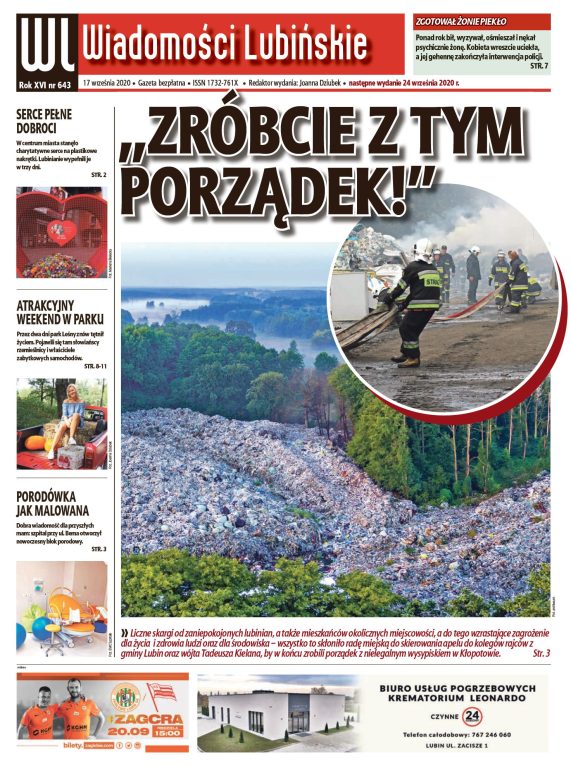 W najnowszym numerze „Wiadomości Lubińskich”, który ukaże się jutro, 17 września, wracamy do tematu składowiska w Kłopotowie. Piszemy także o sercu na nakrętki, które wyjątkowo przypadło do gustu lubinianom , a w obszernych fotorelacjach przypominamy ostatni weekend w parku Leśnym.