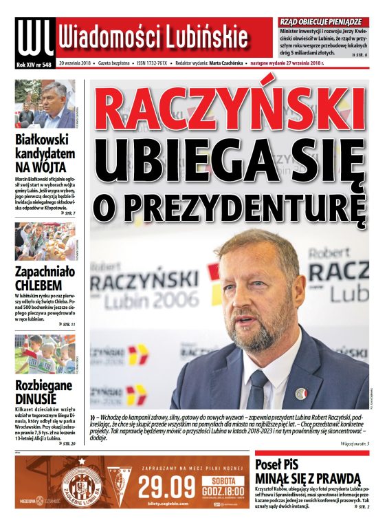 W najświeższym numerze „Wiadomości Lubińskich”, który ukaże się już jutro (20 września), przeczytacie między innymi o tym, że Robert Raczyński po raz kolejny będzie ubiegał się o prezydenturę w Lubinie.