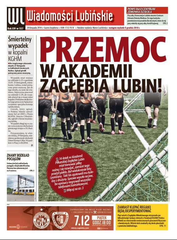 W najnowszym numerze bezpłatnego tygodnika „Wiadomości Lubińskie”, który ukaże się już jutro, 29 listopada, znajdziecie między innymi informację o utworzeniu w naszym mieście Centrum Zdrowia Dziecka oraz artykuł o tym, jak okrutni potrafią być nastolatkowie w stosunku do rówieśników, czyli o przypadku przemocy w Akademii Piłkarskiej Zagłębia Lubin.