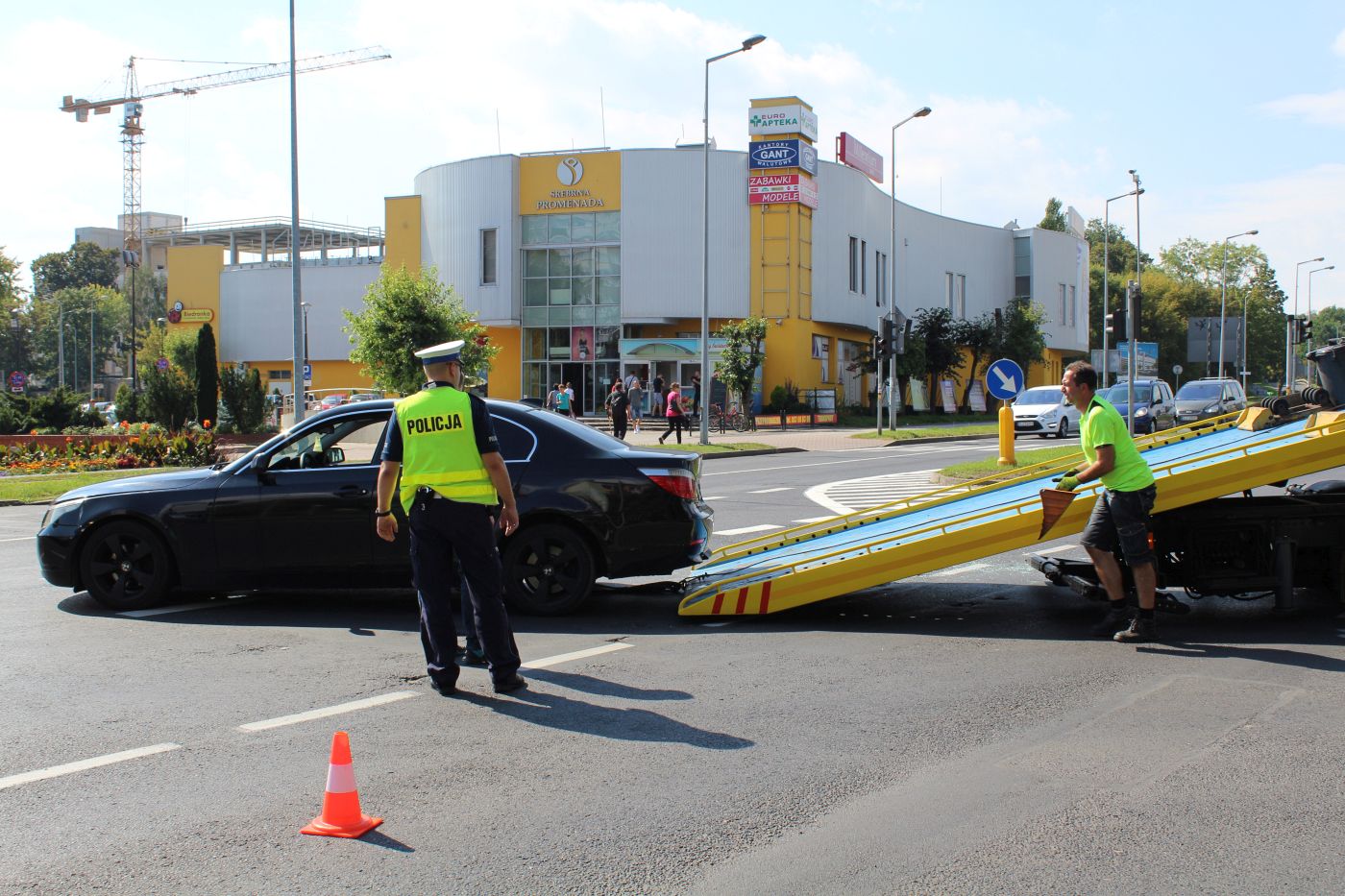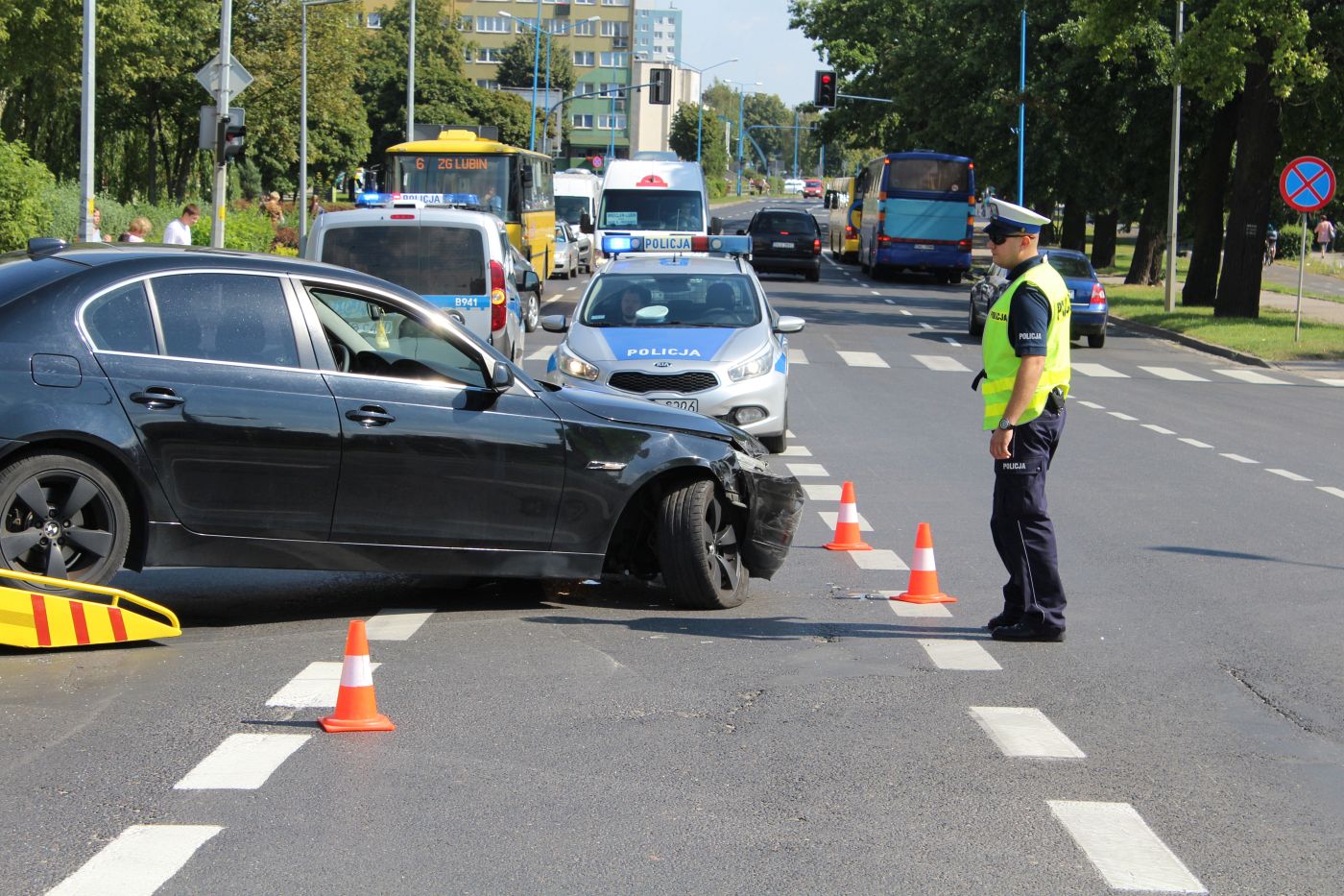 Winę za kolizję ponosi 42-letnia kobieta, która jechała osobowym renaultem. Zamierzając skręcić w lewo z ulicy Skłodowskiej-Curie w al. Kaczyńskiego nie ustąpiła pierwszeństwa kierowcy bmw jadącemu z naprzeciwka w kierunku ul. Tysiąclecia. W kolizji nikt nie został ranny, ale bmw zostało uszkodzone w stopniu uniemożliwiającym mu dalszą jazdę.