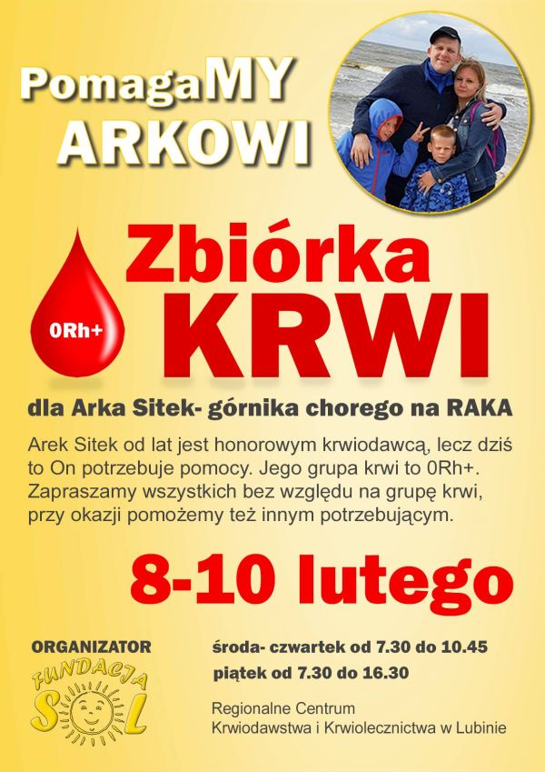Zaczęło się od koleżanki pana Arka, która rzuciła pomysł, by pomóc 32-letniemu górnikowi organizując koncert charytatywny. – Spotkaliśmy się z Arkiem, przebywającym akurat w szpitalu. Miał transfuzję krwi, której ze względu na terapię zwalczającą komórki nowotworowe, potrzebuje dość często. Wcześniej był honorowym dawcą, do tego ma rzadką grupę 0 Rh+. Wpadło mi więc do głowy, że warto byłoby oprócz koncertu zorganizować również zbiórkę krwi – mówi Marcin Domonik, który podjął się organizacji akcji wraz z Fundacją Sol, istniejącą od ubiegłego roku.