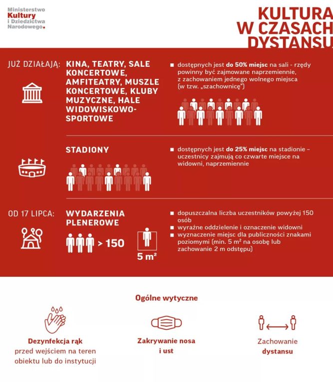 Zaś w halach widowiskowo-sportowych, amfiteatrach i muszlach koncertowych może być zajęta jedynie połowa miejsc na sali, a rzędy powinny być zajmowane naprzemiennie.