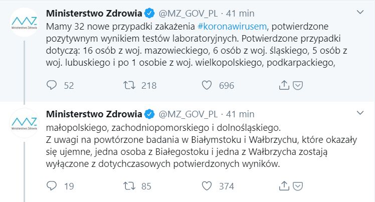 Przed godz. 19 Ministerstwo Zdrowia poinformowało o 32 nowych przypadkach zakażenia.