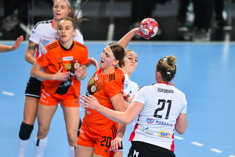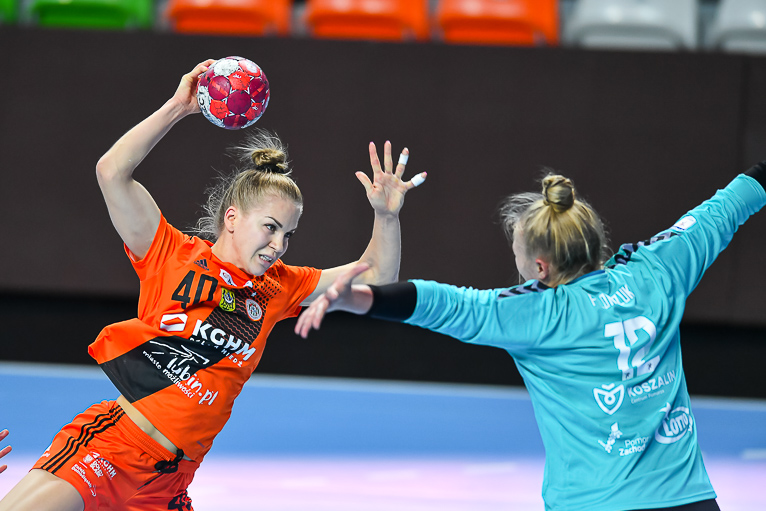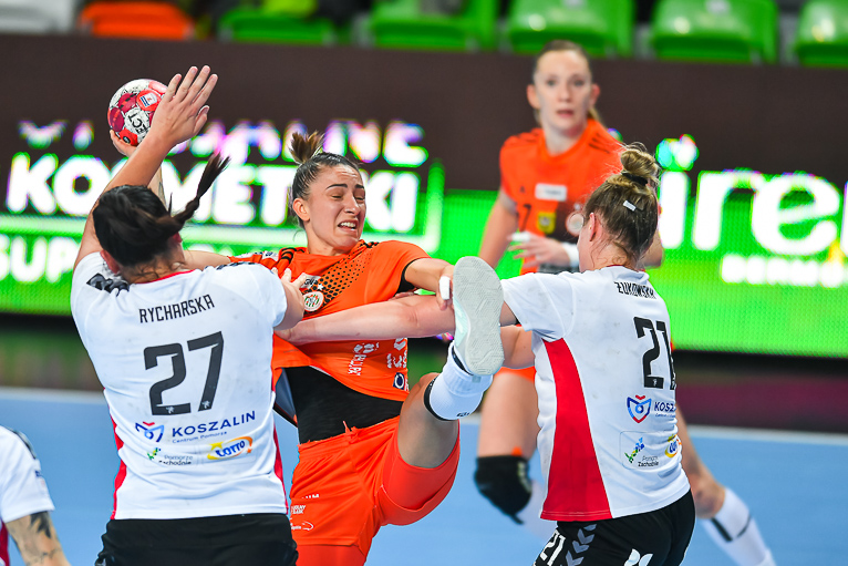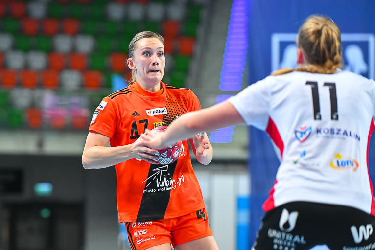 Sam mecz Zagłębie zaczęło od mocnego uderzenia. W cztery minuty lubinianki zdobyły cztery bramki i pokazały, że Młyny Stoisław w Lubinie będą miały bardzo ciężką przeprawę. Na nieporadność swoich zawodniczek od razu zareagował szkoleniowiec przyjezdnych, jednak ekipa z Koszalina nie potrafiła znaleźć sposobu na świetnie dysponowane Miedziowe. W bramce od początku szalała Monika Maliczkiewicz, a kolejne akcje ofensywne kończyły się trafieniami miejscowych, dzięki czemu w dziesiątej minucie Zagłębie prowadziło wyraźnie 7:2. Kolejne minuty? To jeszcze większa przewaga podopiecznych Bożeny Karkut i Renaty Jakubowskiej, która przed przerwą zbliżała się do dziesięciu bramek przewagi. Po dwóch kwadransach Zagłębie prowadziło wysoko 18:9, z czego 13 bramek zdobyło trio: Zawistowska-Górna-Drabik. Po stronie koszalinianek prym wiodła Paula Mazurek, która do przerwy zgromadziła cztery bramki.
