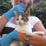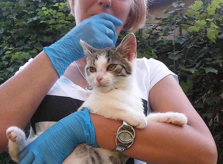 Kot przyjął ratunek z wdzięcznością, łagodnie traktując swojego wybawiciela. Na dole zaś czekała na niego wdzięczna za pomoc właścicielka.