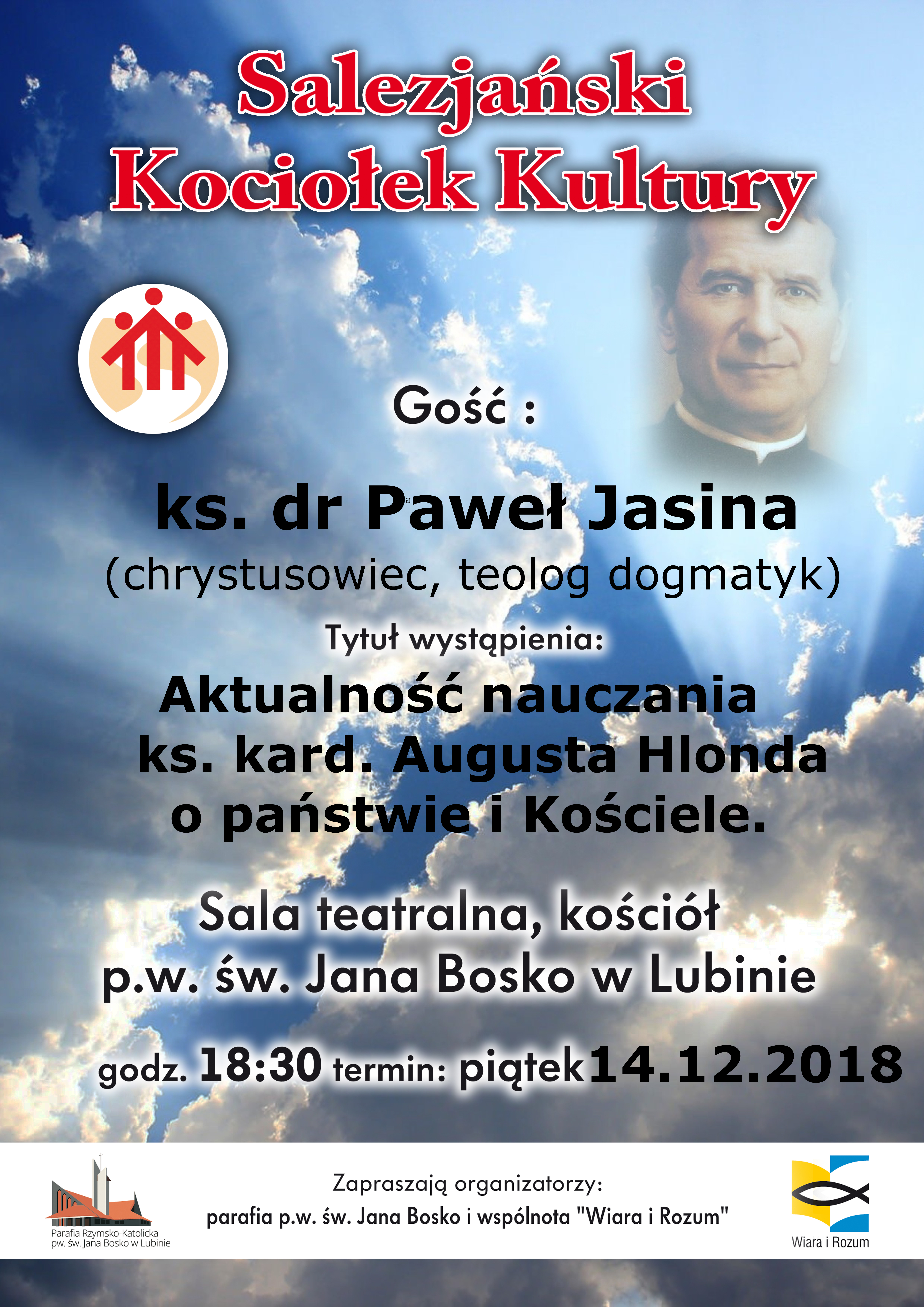 Tym razem gościem Kociołka będzie ks. dr Paweł Jasina (chrystusowiec, teolog dogmatyk), który wygłosi prelekcję zatytułowaną: „Aktualność nauczania ks. kard. Augusta Hlonda o państwie i Kościele”.