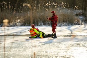 Pod człowiekiem załamał się lód, a poszkodowany wpadł do przerębli – służby ratunkowe z powiatu lubińskiego wzięły dziś udział w ćwiczeniach na zbiorniku wodnym potocznie nazywanym cegielnią, położonym koło Ręszowa w gminie Ścinawa.