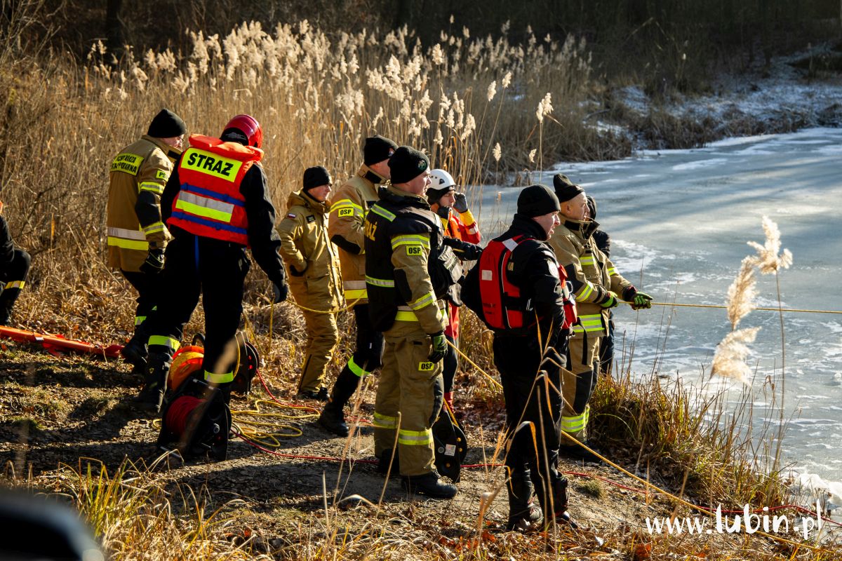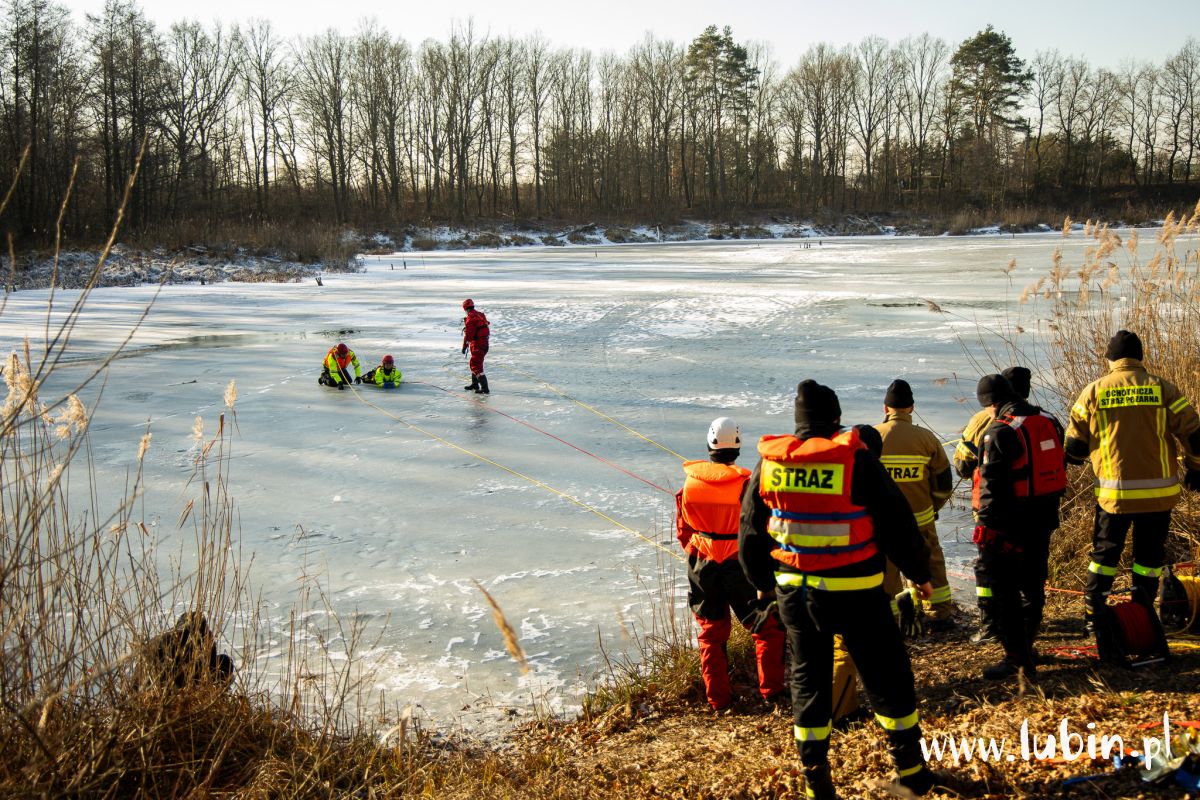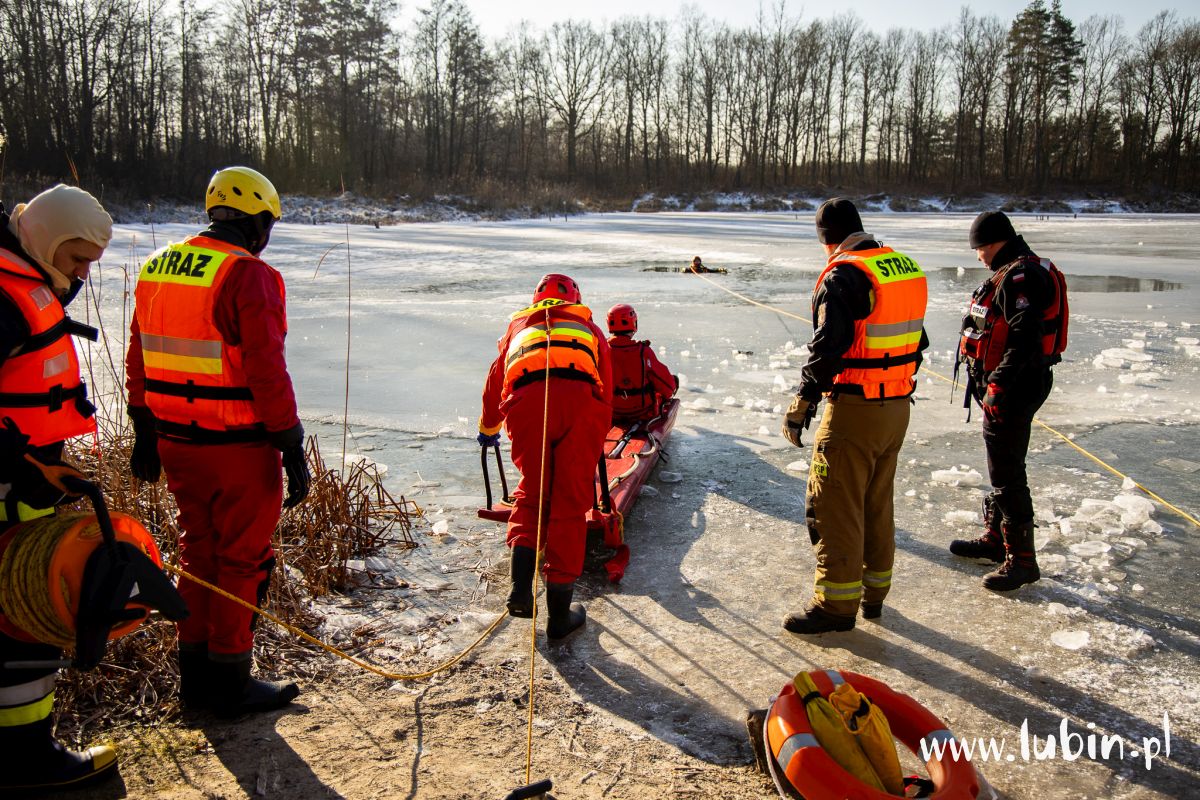Pod człowiekiem załamał się lód, a poszkodowany wpadł do przerębli – służby ratunkowe z powiatu lubińskiego wzięły dziś udział w ćwiczeniach na zbiorniku wodnym potocznie nazywanym cegielnią, położonym koło Ręszowa w gminie Ścinawa.