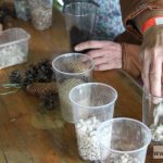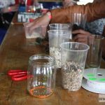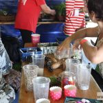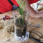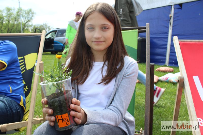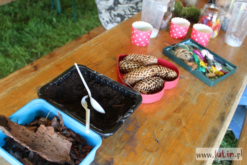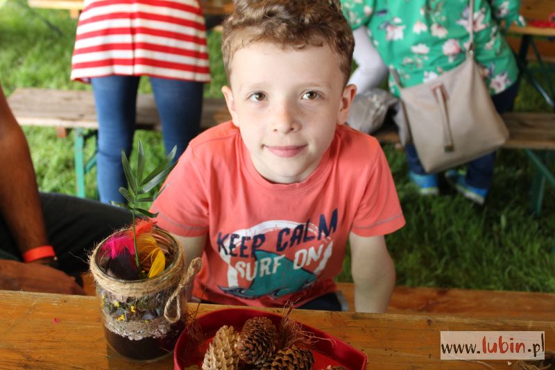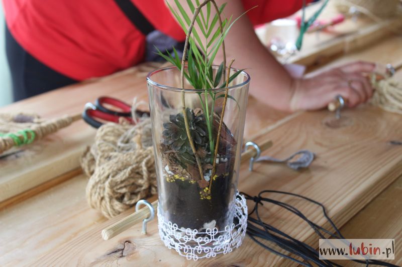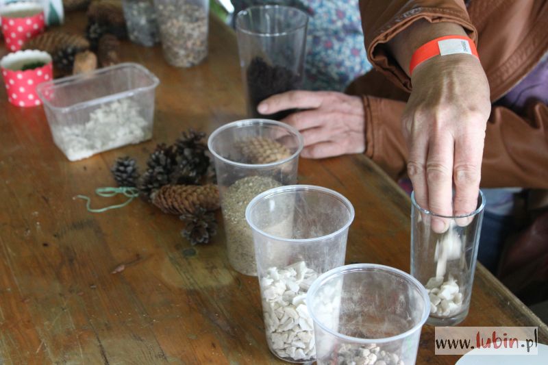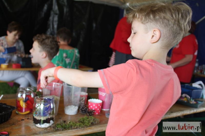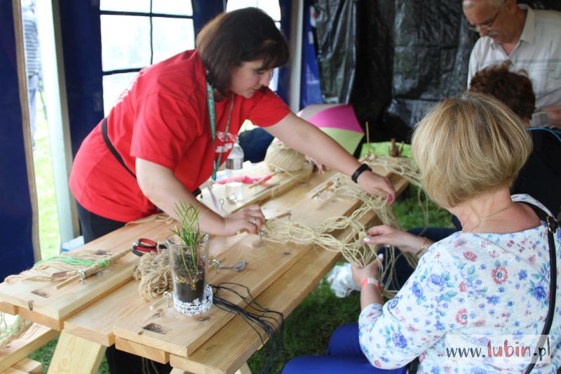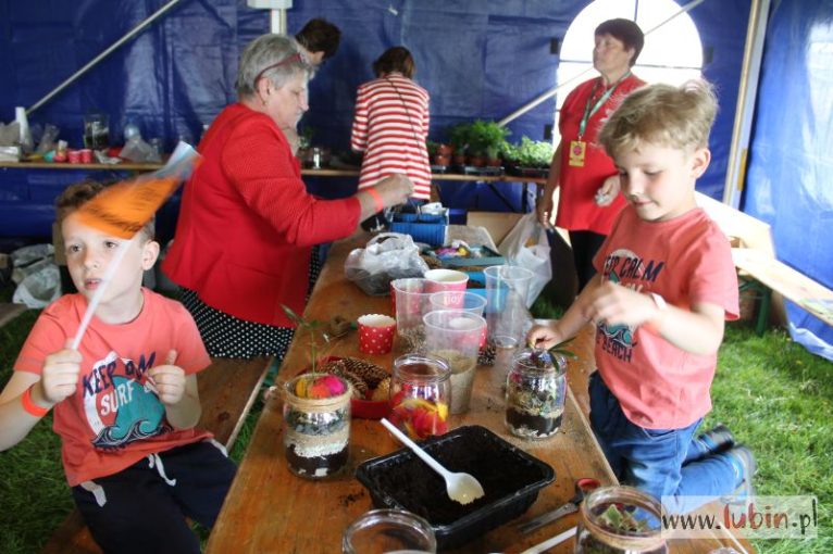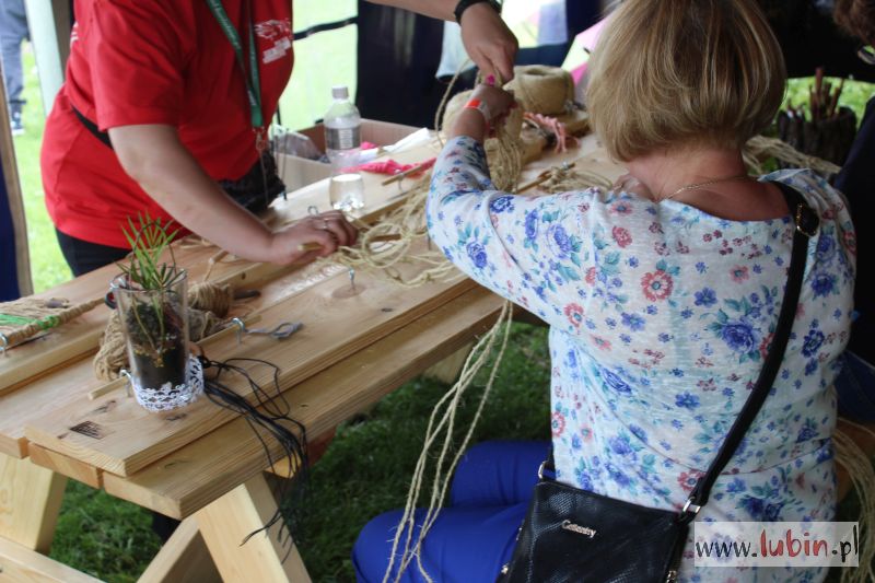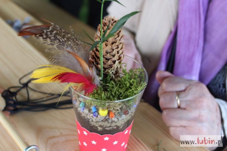 W drugim namiocie czekają na nas szklanki, kubki i słoiki. Zaraz obok kawałki kory, szyszki, ziemia, kamyki. Dalej kolorowe piórka, ozdobne wstążki, mulina i dratwa. Pomysłodawczynie projektu zachęcają lubinian do własnoręcznego przygotowania kwiatowej kompozycji w szkle.