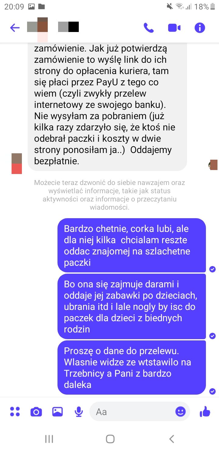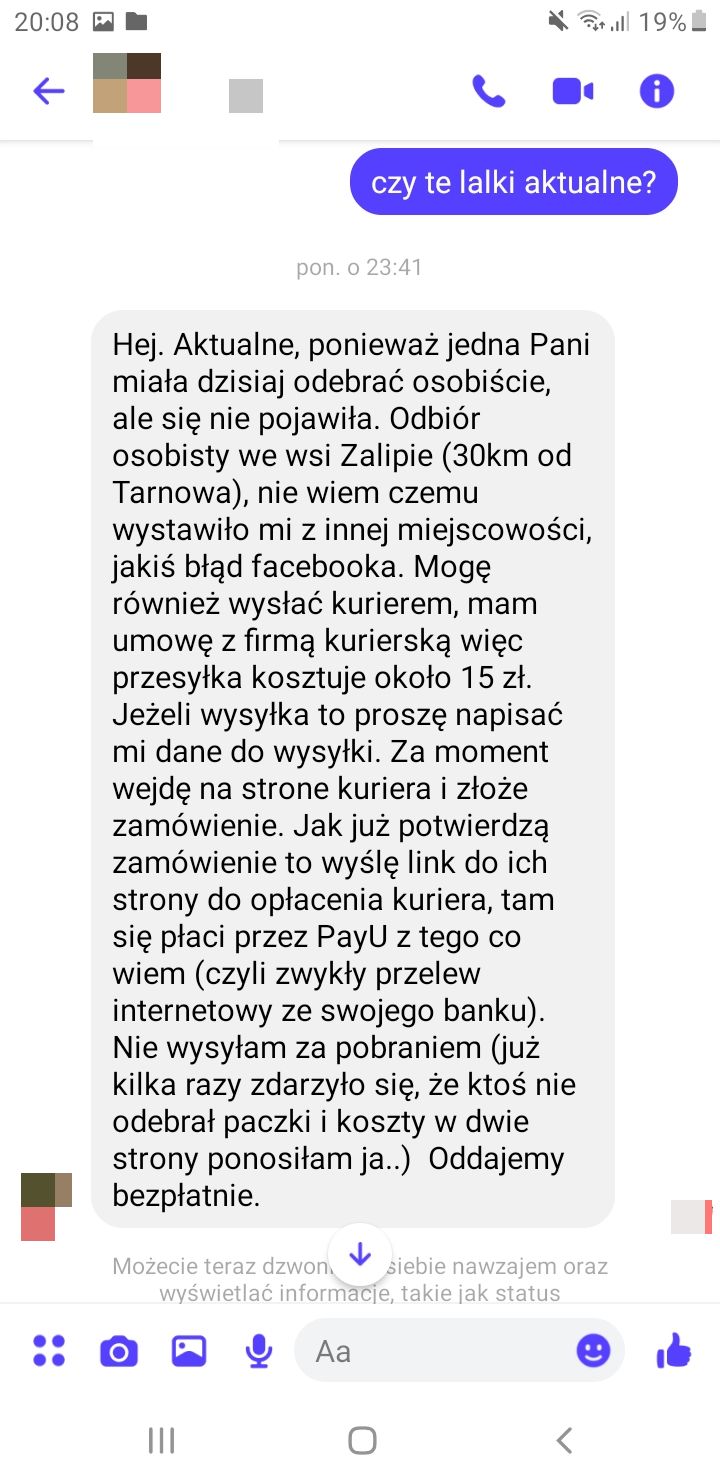 Ta historia wraca niczym bumerang i po raz kolejny przypomina nam o zachowaniu czujności w sieci. O oszustwach na lalki Barbie pisaliśmy już dwukrotnie (tutaj i tutaj). Kobieta, która postanowiła ponownie nagłośnić tę sprawę, twierdzi, że oszustka lub oszust dla niepoznaki zmienia dane osobowe na Facebooku. Na dowód tego otrzymaliśmy też screeny (zrzuty z ekranu) ogłoszeń w mediach społecznościowych oraz rozmów, zawierających dokładne instrukcje dotyczące sposobu zapłaty.