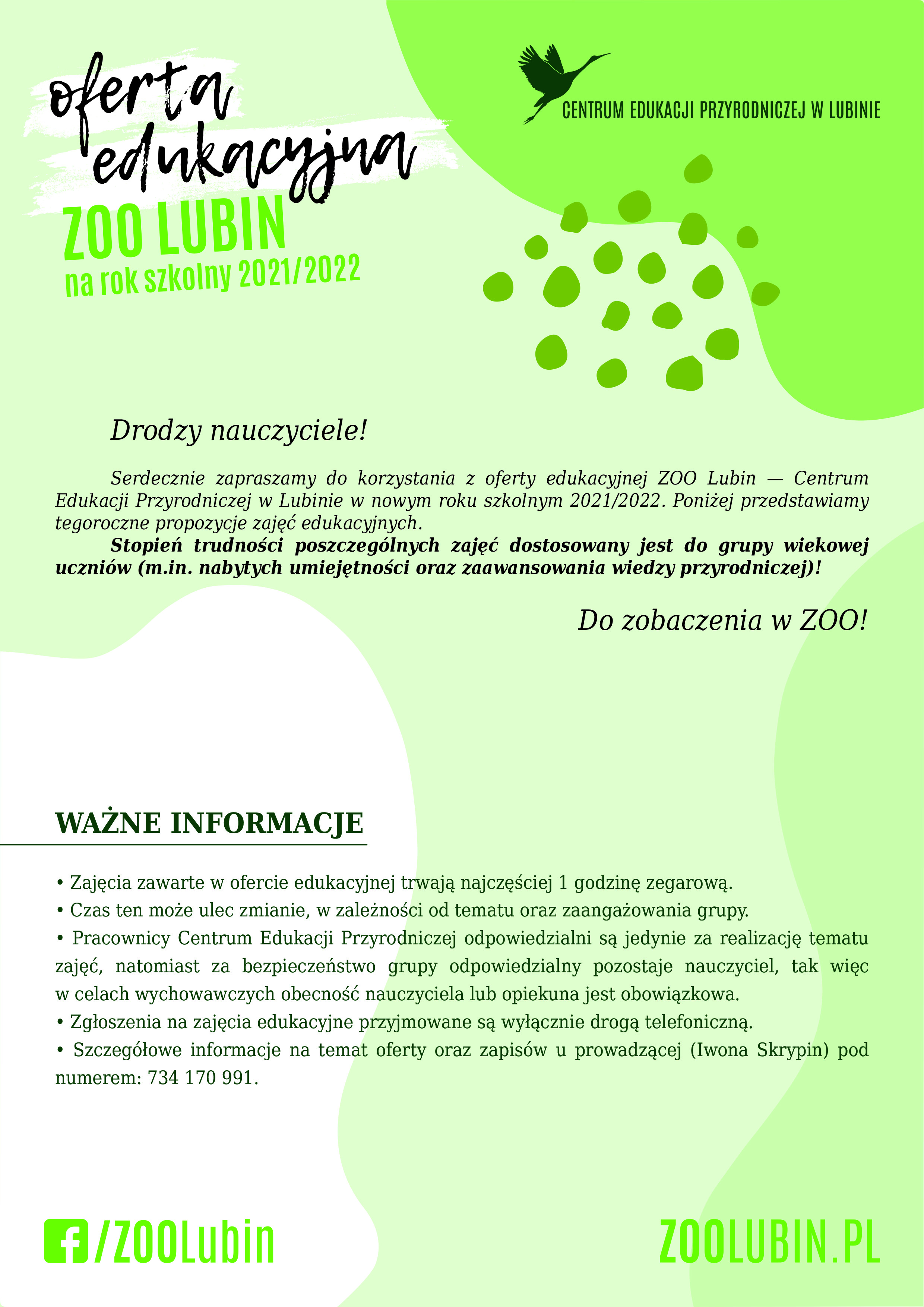 ZOO Lubin – Centrum Edukacji Przyrodniczej zaprasza do zapoznania się z nową ofertą edukacyjną. Propozycje warsztatów w roku szkolnym 2021/2022 skierowane są do przedszkolaków i uczniów szkół z Lubina oraz okolic.