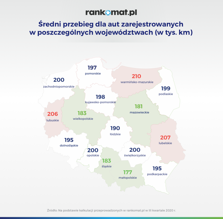 Najlepiej w zestawieniu wypada Małopolska. Przeciętne auto z województwa małopolskiego przejechało do tej pory 177 tys. km. W województwie mazowieckim ta wartość jest większa o 4 tys. km, a w śląskim i wielkopolskim o 6 tys. km. Największy średni przebieg swoich samochodów deklarują kierowcy z województw lubuskiego (206 tys. km), lubelskiego (207 tys. km) i warmińsko-mazurskiego (210 tys. km). To jednocześnie 3 województwa, w których średni przebieg auta przekracza 200 tys. km.