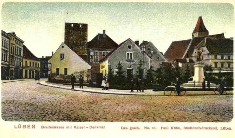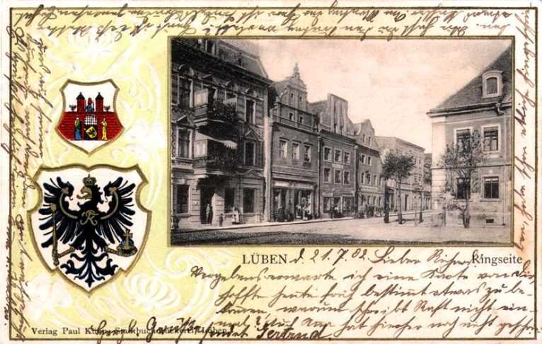 Na prezentowanej pocztówce z 1902 roku widoczna jest zachodnia pierzeja lubińskiego rynku oraz fragment ratusza (z prawej strony). Pocztówka została wydana w drukarni znanego lubińskiego wydawcy Paula Kühna.
