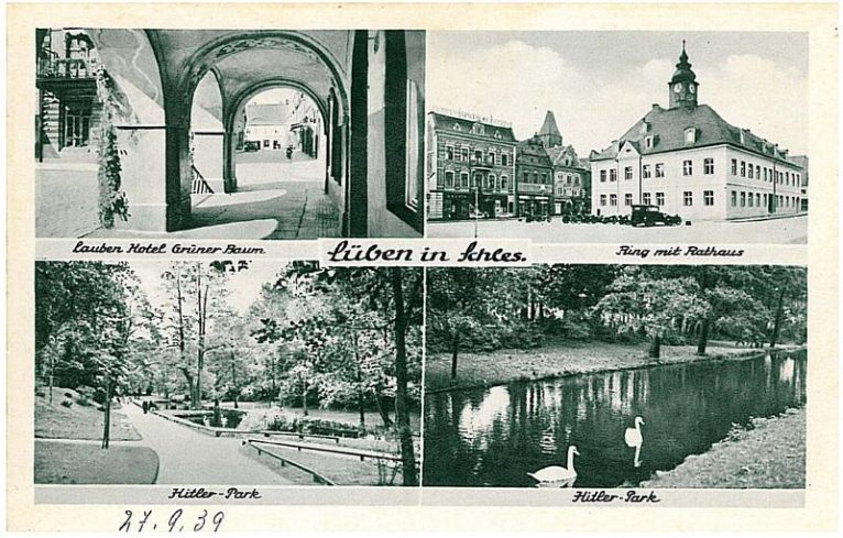 Od góry po lewej widok na Oberglogauerstrasse (Głogowskiej Górnej) spod arkad hotelu Pod Zielonym Drzewem. Po prawej budynek lubińskiego ratusza po remoncie i na dole dwa widoczki z lubińskiego parku miejskiego (obecny park marszałka Piłsudskiego).
