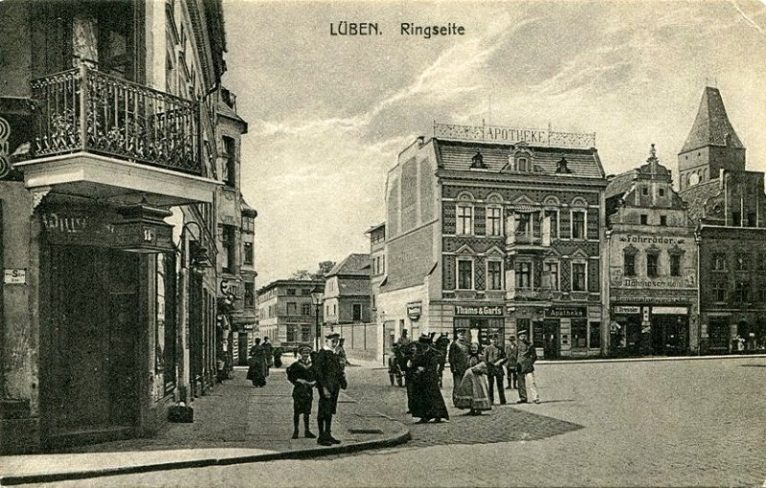 Pocztówka wydana w 1916 roku przez lubińskiego wydawcę Gustava Geistefeldta, według zdjęcia legnickiego fotografa W. Bittnera, ukazuje południowo-zachodni narożnik lubińskiego rynku. Po lewej stronie, na pierwszym planie prezentuje się słynny balkonik pani Scholz. W głębi wylot obecnej ulicy Odrodzenia (Bahnhoffstrasse).