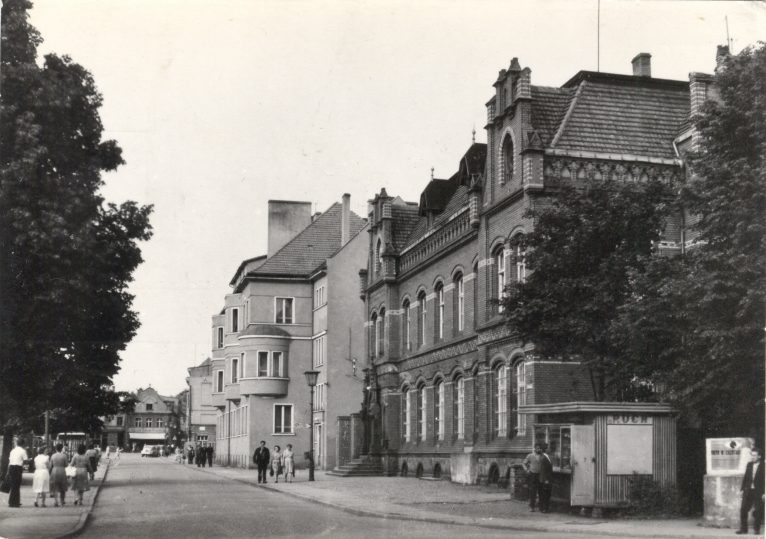 Ulica Odrodzenia z początku lat 60. ubiegłego wieku. Motyw przedstawiony na pocztówce jest znany z wielu przedwojennych pocztówek. Wprawdzie stempel pocztowy wskazuje rok 1969, to kartka jest dużo starsza, ponieważ już od 1963 roku w rynku nie było przedwojennych kamieniczek, które tu są jeszcze widoczne w głębi fotografii.