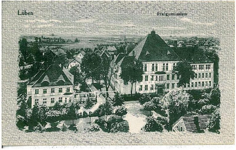 Lüben – Realymnasium. Decyzję o budowie nowego nowej szkoły średniej rada miejska podjęła już w 1907 roku, a uroczystego otwarcia dokonano 6 maja 1911 r. Pierwszym dyrektorem nowego Realgymnasium został dr Caspari, który funkcję tę pełnił już od 1 października 1907 r. do 19 stycznia 1918 r. Pocztówka przedstawia dzisiejsze I Liceum Ogólnokształcące im. Mikołaja Kopernika, widoczne z dzwonnicy ówczesnego kościoła ewangelickiego. Z budynkiem szkoły jest symbolicznie połączony sześciosegmentową pergolą tzw. dom dyrektora. Nazwa miała bezpośredni związek z miejscem zamieszkiwania aktualnego dyrektora szkoły.