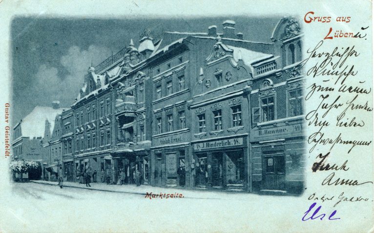 Na pocztówce z 1898 roku widoczna jest niemal cała pierzeja wschodnia lubińskiego rynku w zimowej szacie. W głębi, po lewej stronie widać podcienia hoteli Pod Zielonym Drzewem.