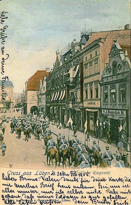 Przemarsz dragonów z regimentu von Bredow przez lubiński rynek. Dragoni poruszają się kolumną wzdłuż pierzei wschodniej w kierunku północnym, w stronę hotelu Pod Zielonym Drzewem, po którego minięciu wjadą zapewne w nieistniejącą już dzisiaj ulicę Oberglogauerstrasse (Głogowską Górną).