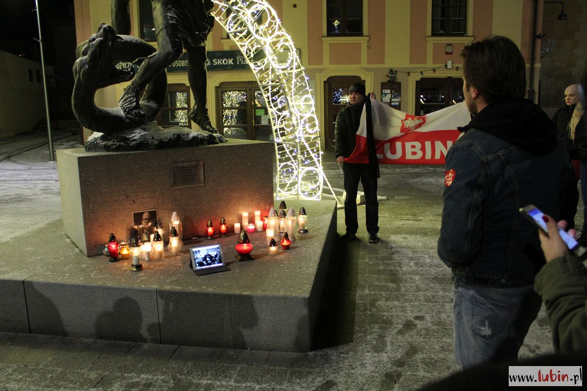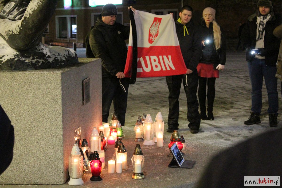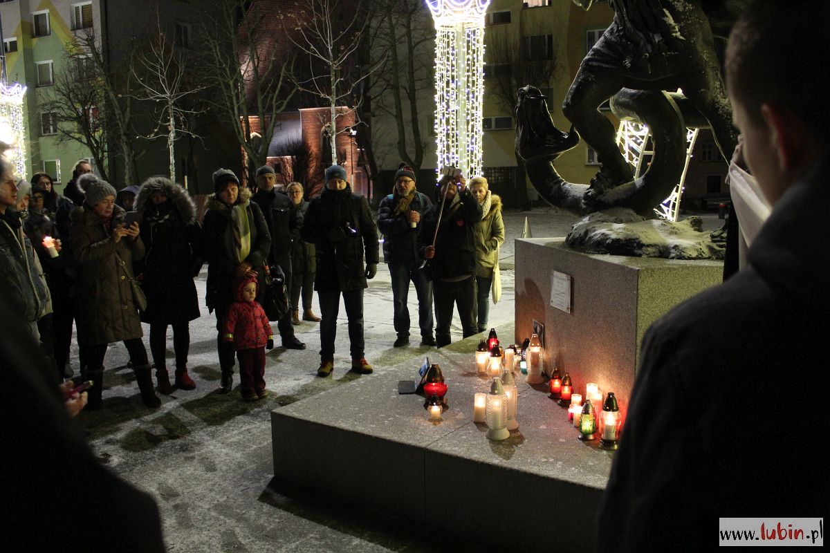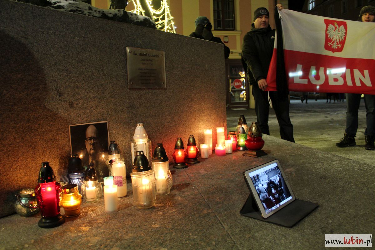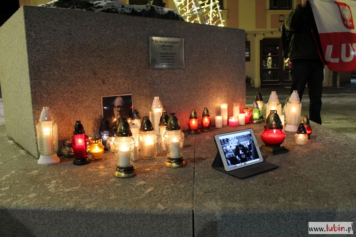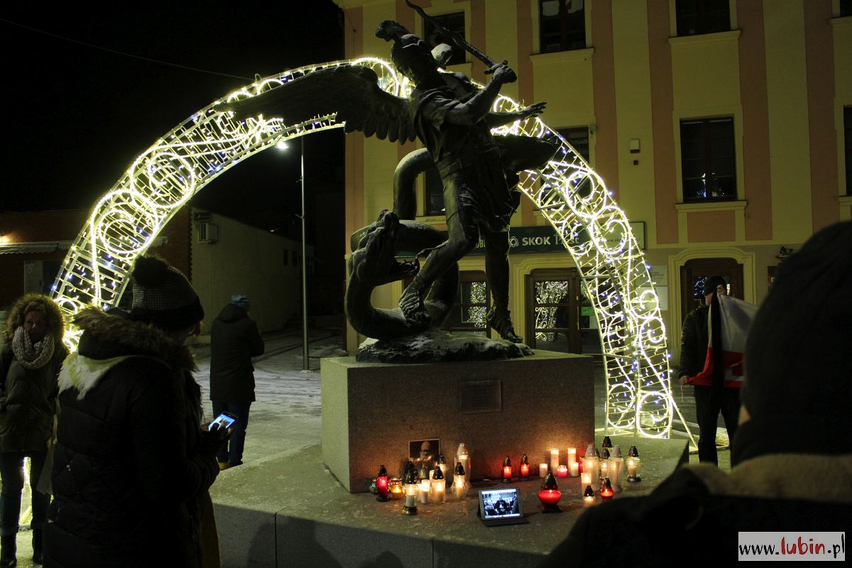 Pod rzeźbą Michała Archanioła zapłonęły znicze. Od godziny 20 lubinianie w milczeniu podchodzili, by postawić kolejne świeczki. Ci, którzy nie mieli ze sobą zniczy, przystawali w zadumie, zapalając symboliczne światełko telefonu komórkowego.