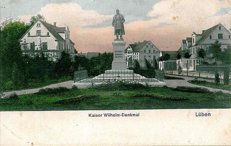 Pomnik cesarza Wilhelma I wydaje się być najbardziej okazałym ze wszystkich przedwojennych pomników lubińskich. Postawiony był vis a vis wejścia do domu towarowego, przy skrzyżowaniu obecnych ulic Kopernika i Tysiąclecia. Za nim, po prawej w głębi budynek Diaconissenhaus.