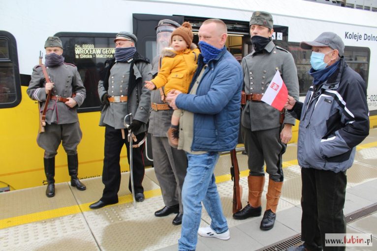 Jak na Święto Niepodległości przystało, były wojskowe mundury i biało-czerwone flagi. Na stacji Lubin dwukrotnie zatrzymał się dziś historyczny pociąg.
