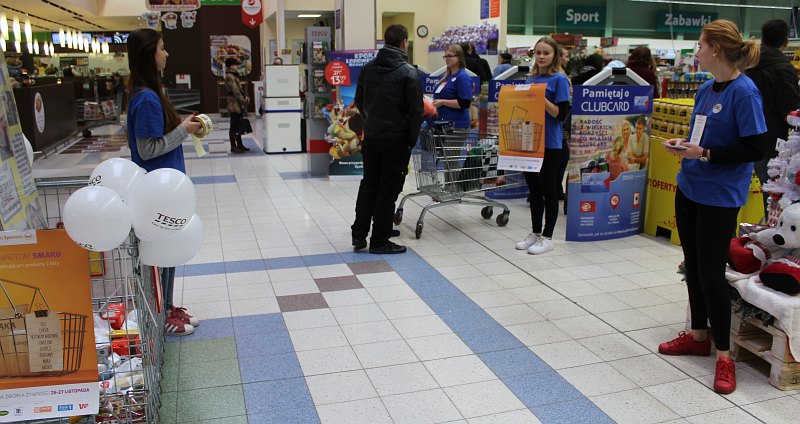 Wolontariusze starają się nikogo nie zaczepiać. Stoją z plakatami i informacjami w pasażu handlowym hipermarketu obok pojemników, w których można zostawić żywność. Spotkać można ich przy obu wejściach do sklepu.