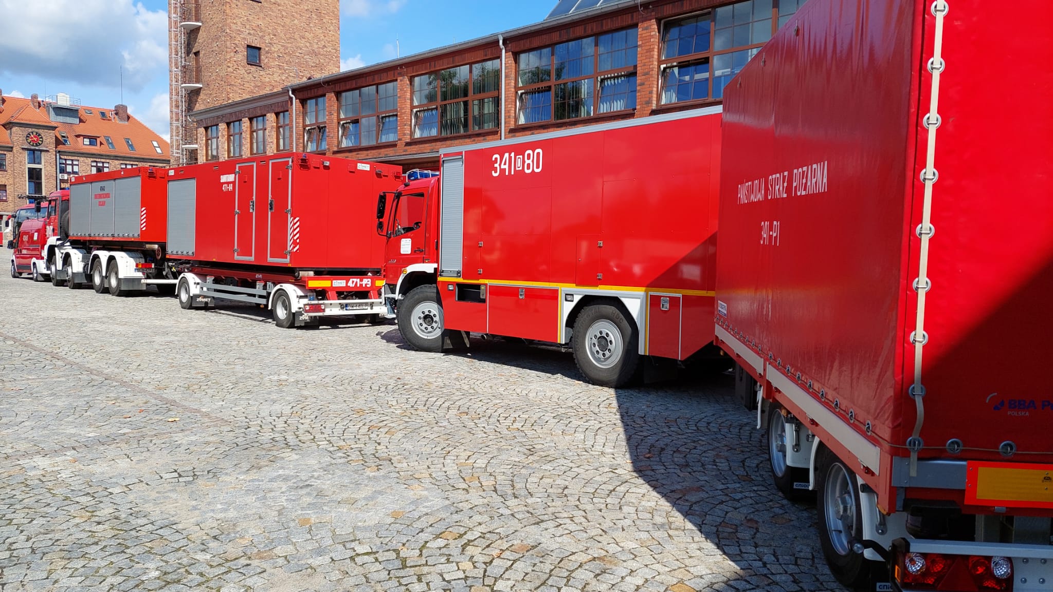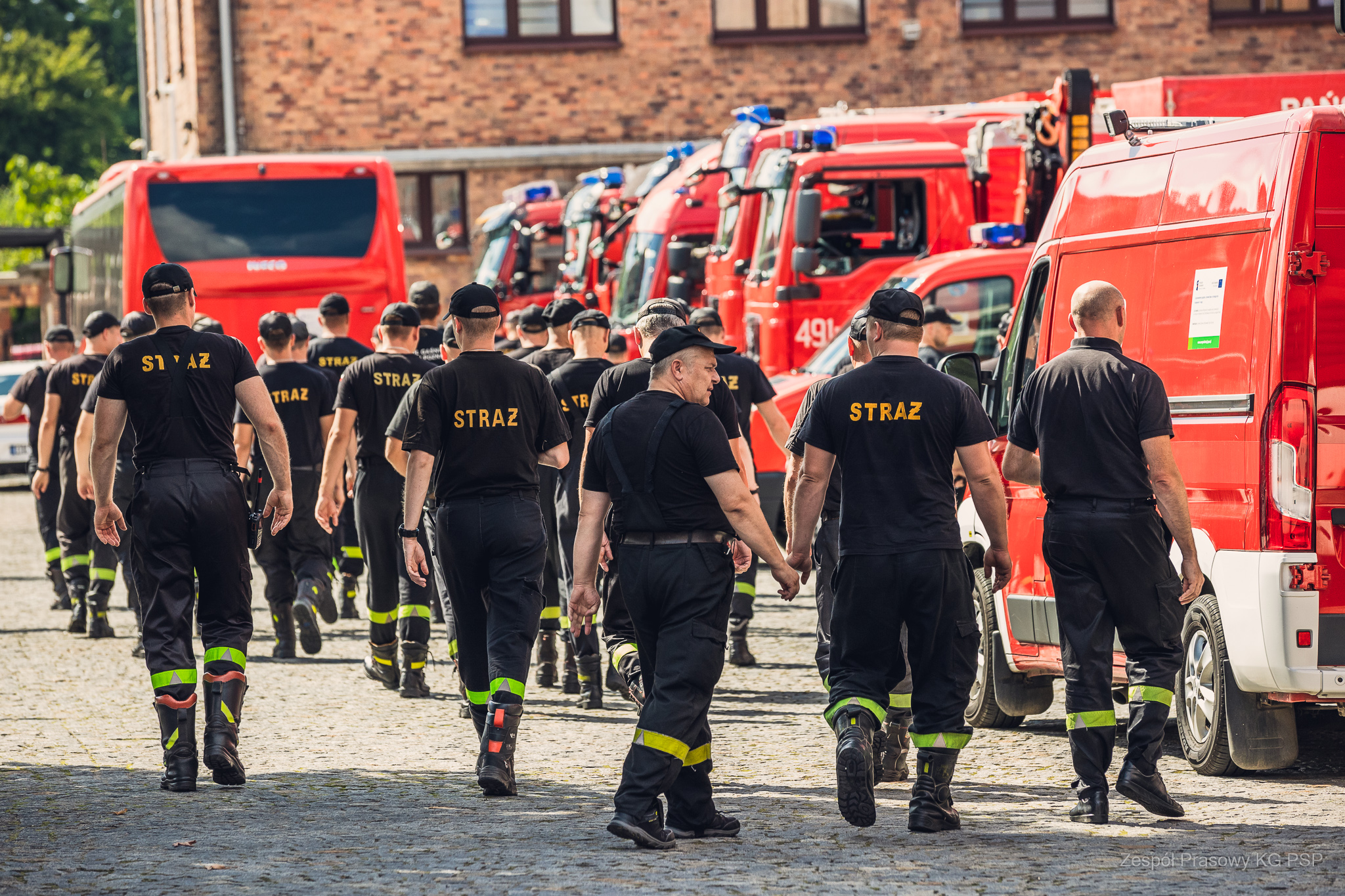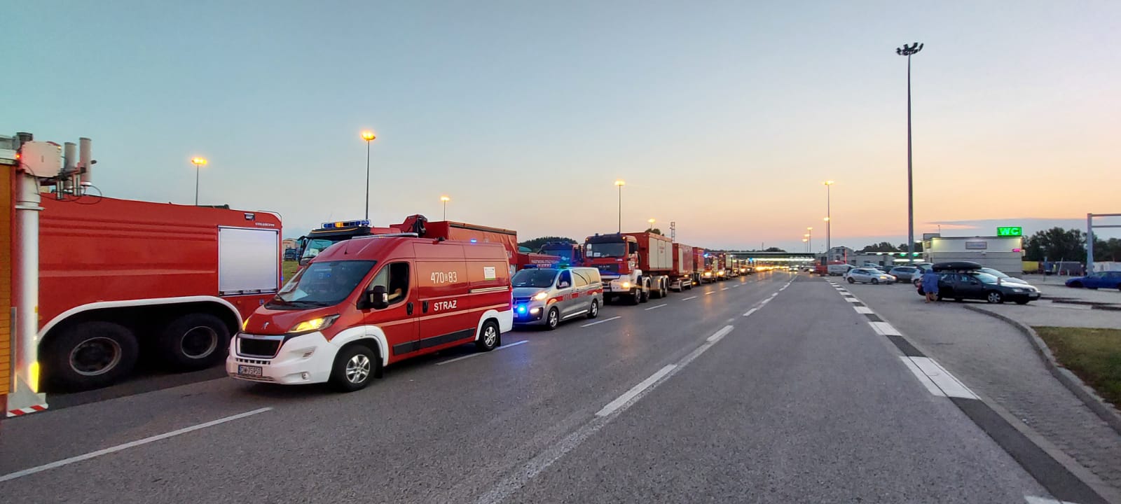 W konwoju jadą: samochody gaśnicze, specjalne, dowodzenia i łączności, kontenery, quady, busy, autobusy i przyczepy.