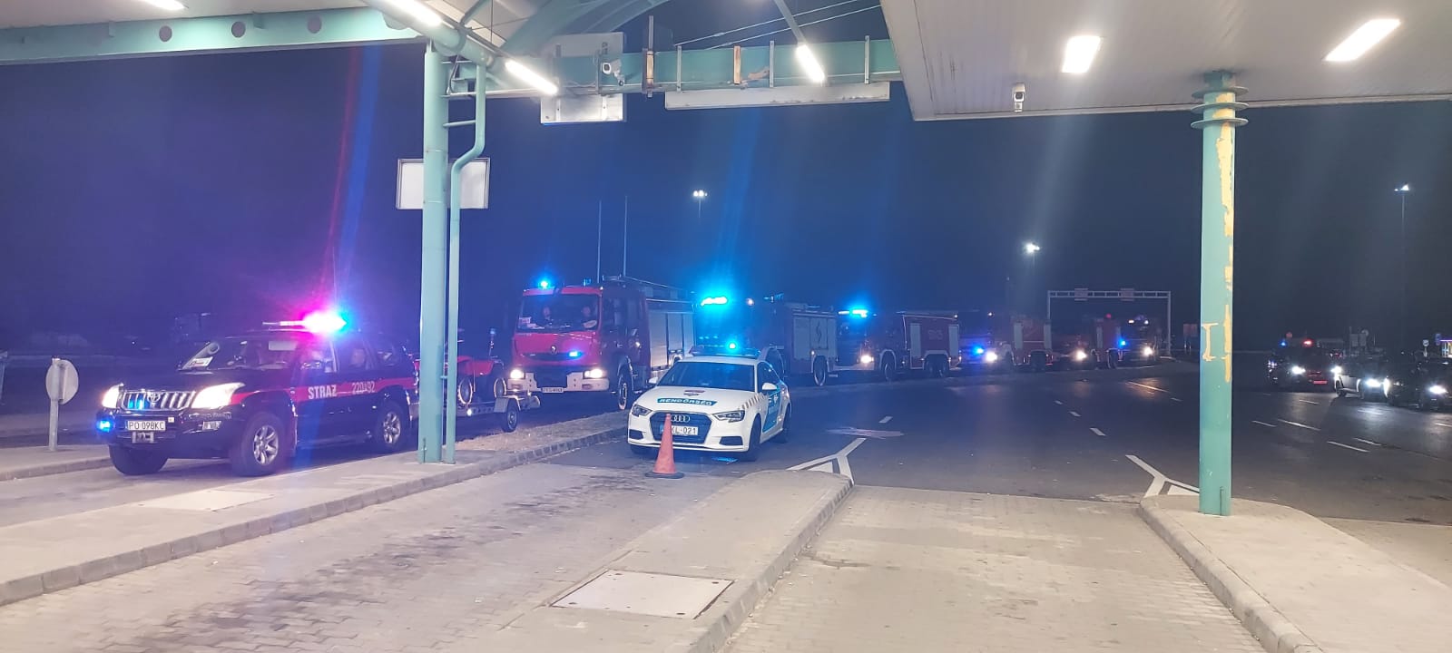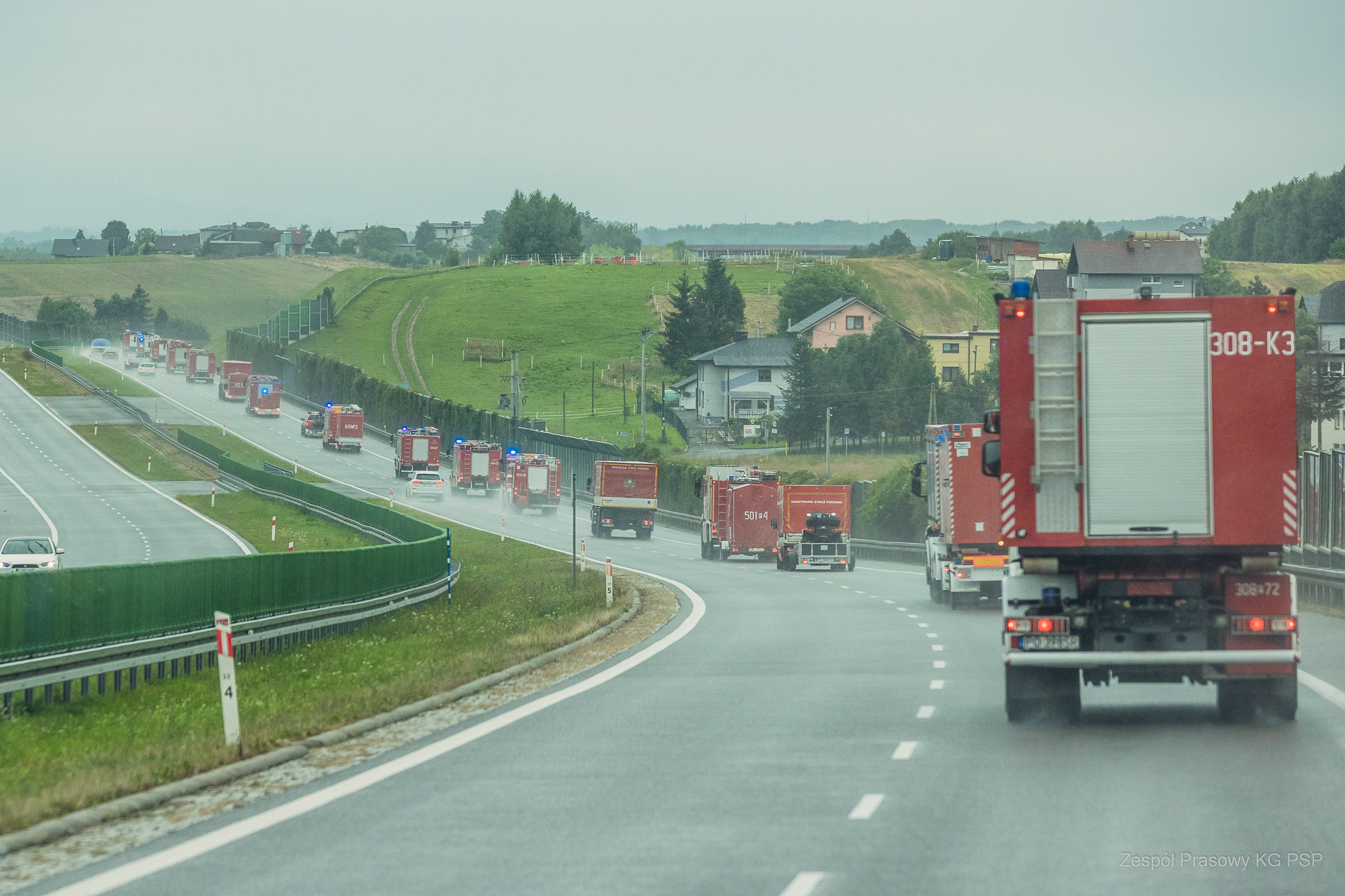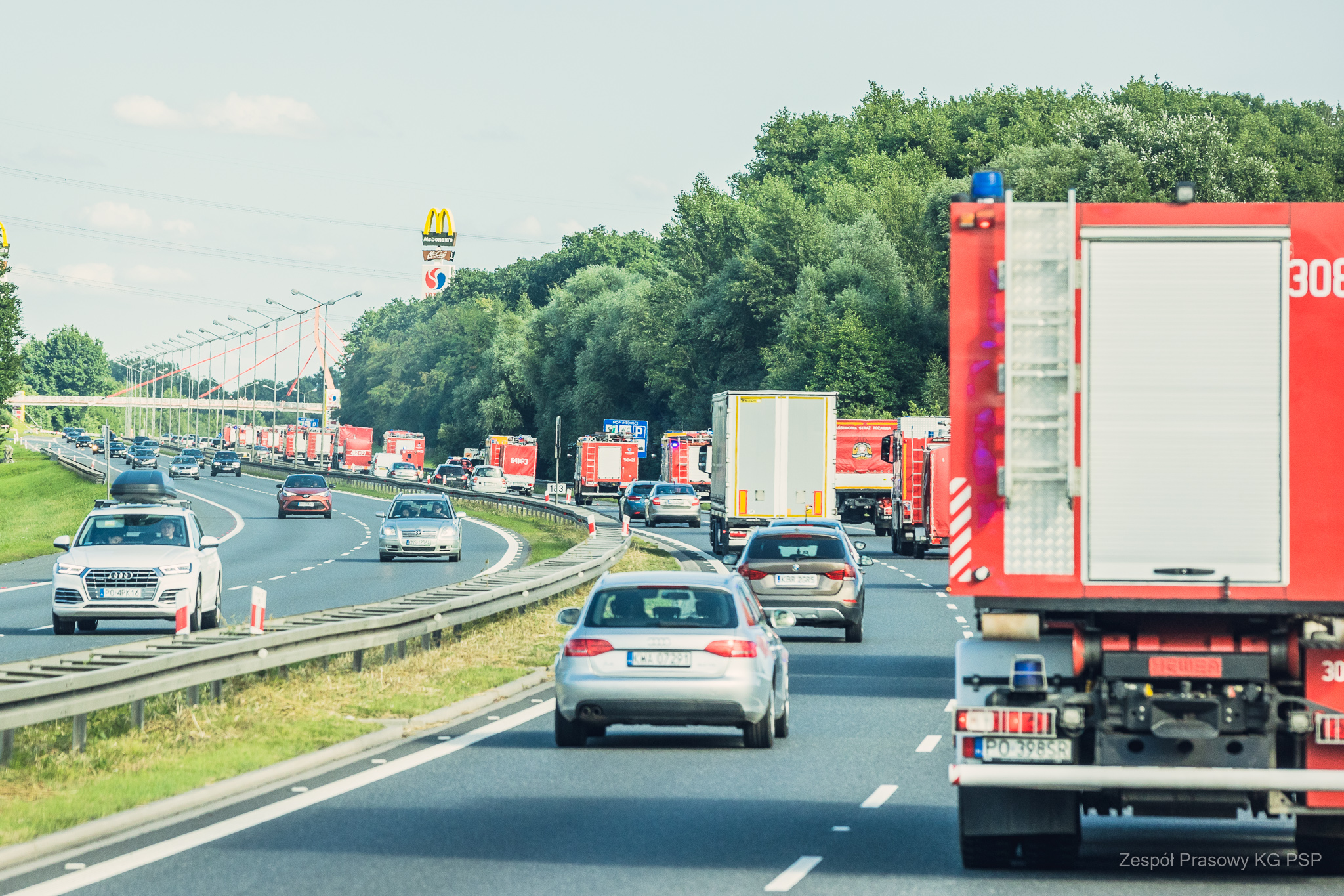W konwoju jadą: samochody gaśnicze, specjalne, dowodzenia i łączności, kontenery, quady, busy, autobusy i przyczepy.