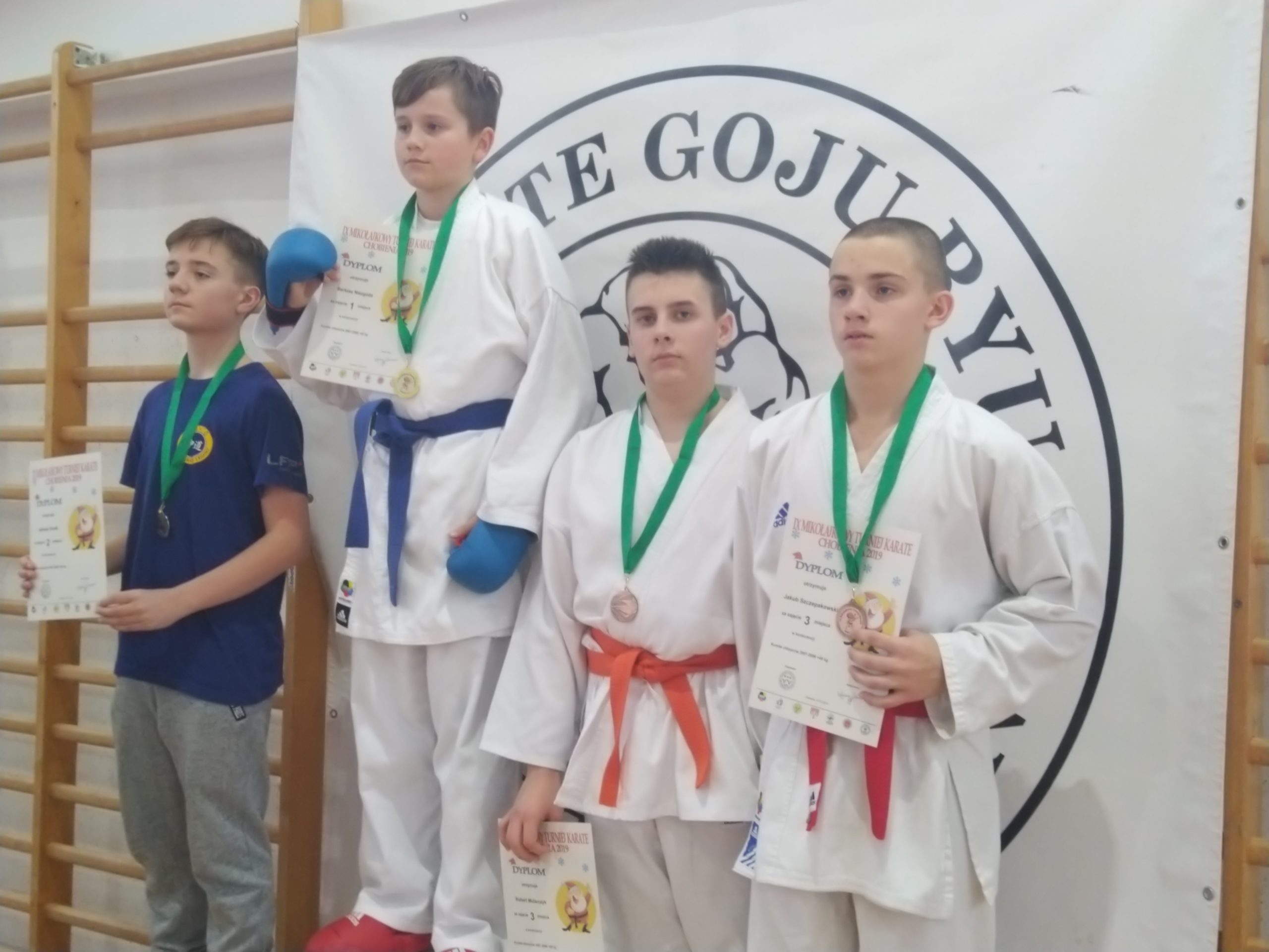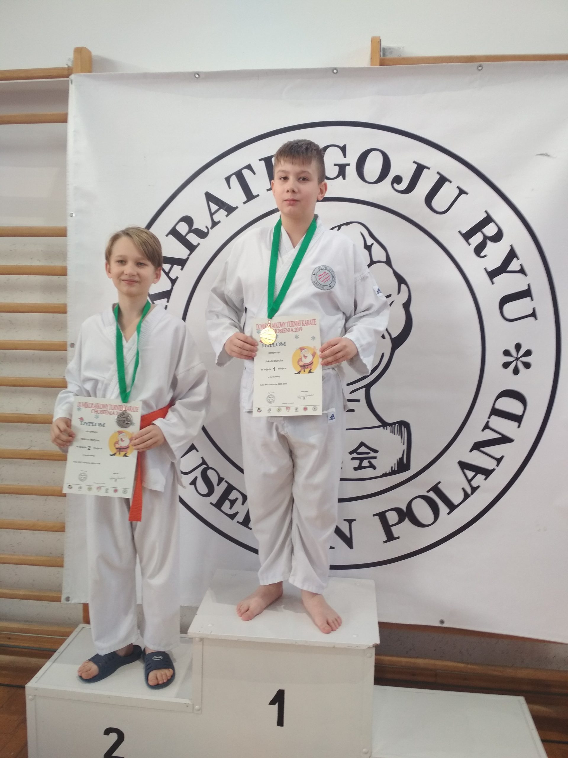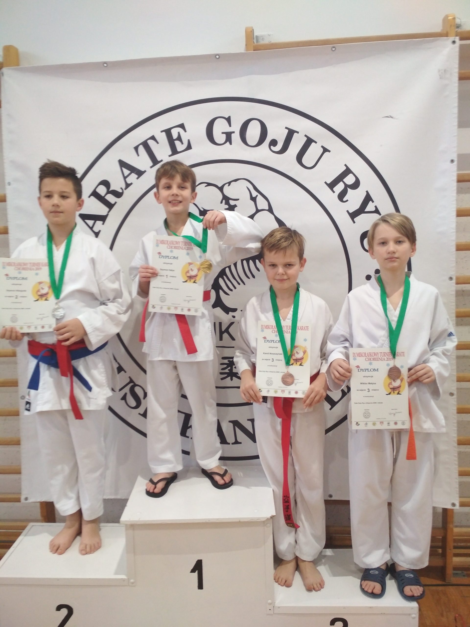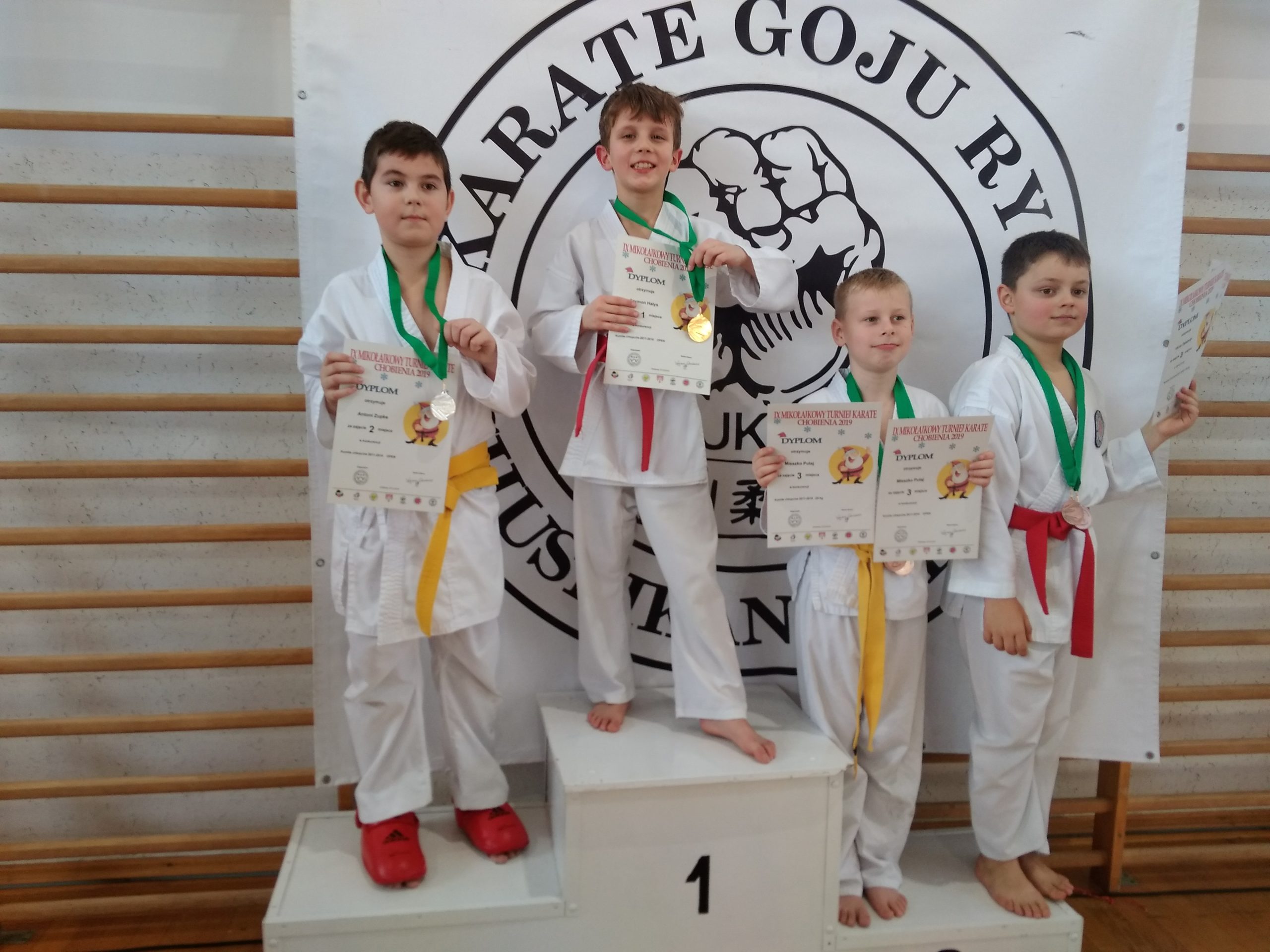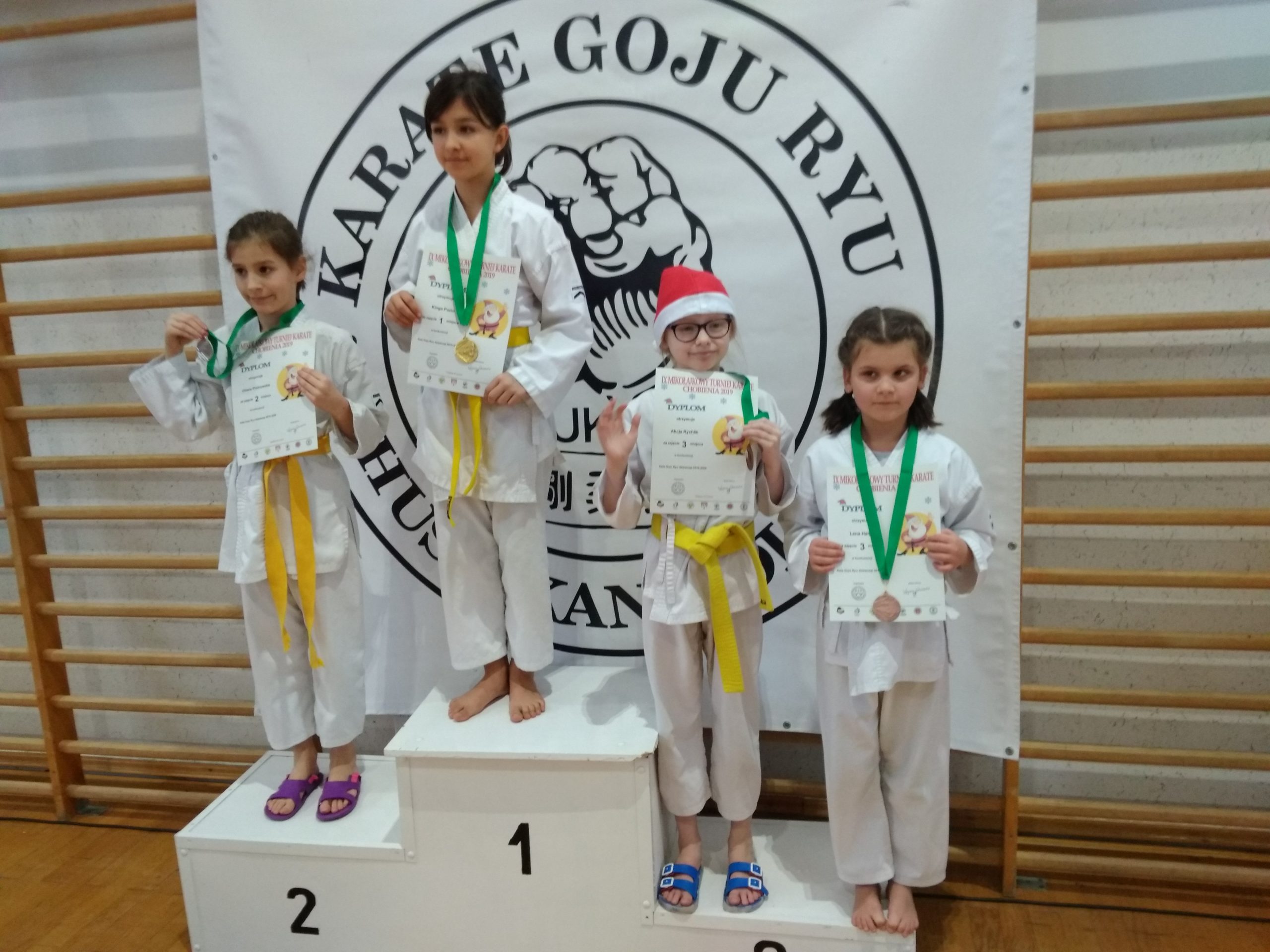Dyrektor Zespołu Szkół w Chobieni Roman Kuziak, uhonorowany został pucharem za wkład w rozwój karate Goju Ryu. Organizatorzy docenili również najliczniejszy klub, który otrzymał pamiątkowy puchar. Świąteczna atmosfera szybko wypełniła salę, bo wszyscy założyli mikołajkowe czapeczki. Od tej pory było biało i czerwono.