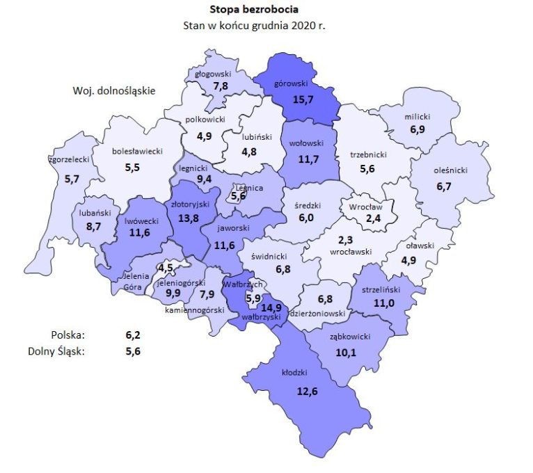 W ciągu całego 2020 r. stopa bezrobocia w powiecie lubińskim wzrosła z 4 do 4,8 proc. i cały czas jest niższa niż wskaźnik dolnośląski (wzrost 4,6 do 5,6 proc.) i krajowy (wzrost z 5,2 do 6,2 proc.). Z pewnością sprzyja temu fakt, że duża liczba mieszkańców pracuje w przemyśle miedziowym i jego otoczeniu, które nie odczuły skutków dwóch ogólnokrajowych lockdownów.