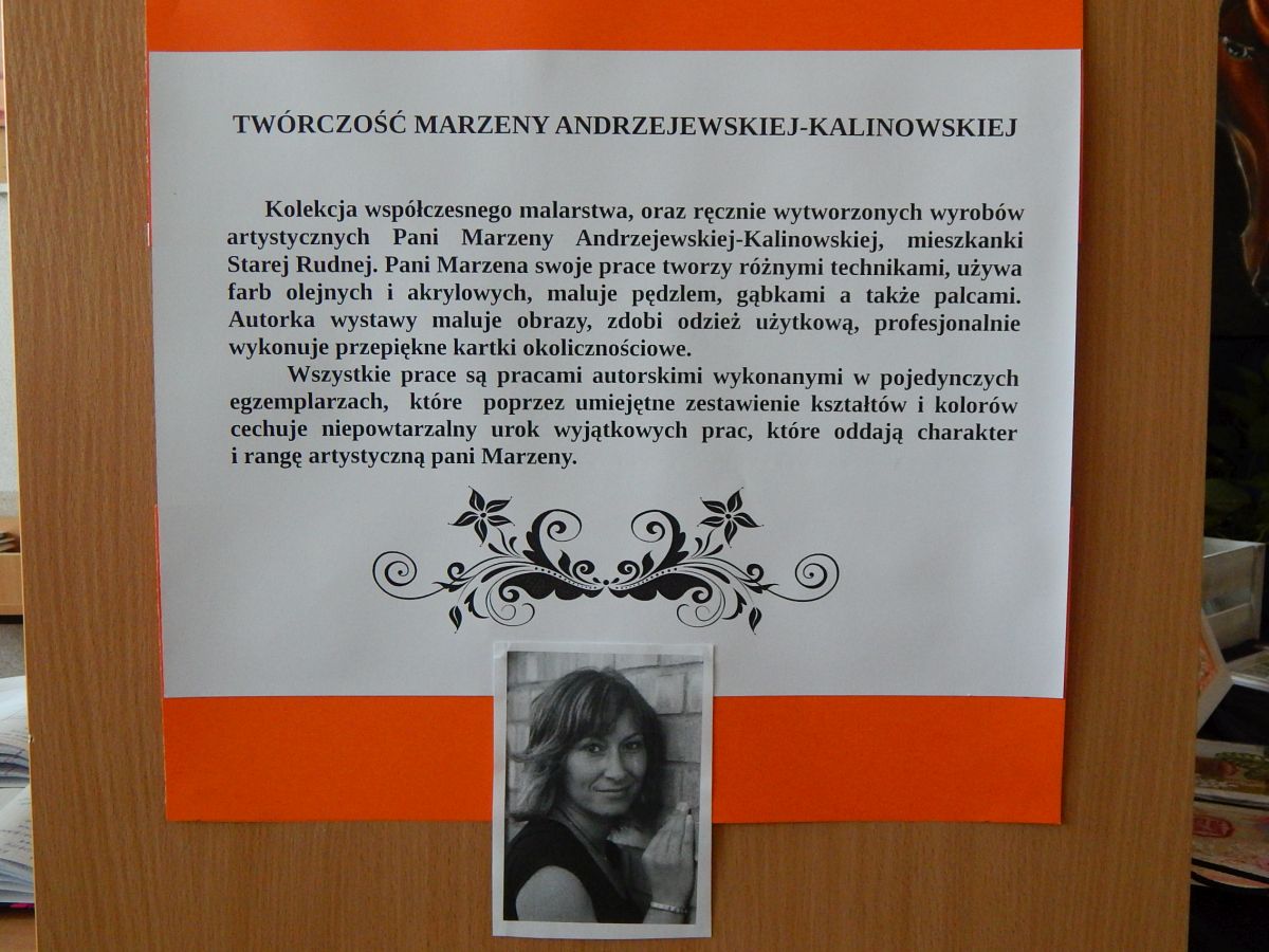 W ramach cyklu „Ludzie z pasją” tym razem Multimedialne Centrum Informacji Szkoły Podstawowej im. Jana Pawła II w Rudnej zaprasza na wystawę prezentującą twórczość pani Marzeny. To kolekcja współczesnego malarstwa oraz ręcznie wytworzonych wyrobów artystycznych.