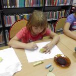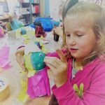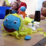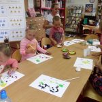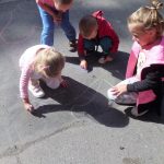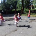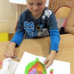 Malowanie farbami, ale nie takie zwykłe, bo przy użyciu słomek do napojów sprawiło dzieciom sporo frajdy. Efektem były śliczne stworki i potworki. Malowanie kredą po kartce? To możliwe, ale jeśli wymoczymy kredę w wodzie z cukrem, kolory będą bardziej wyraziste, a cukier nada ciekawą strukturę. Dzieci udekorowały swoje prace brzozowymi krążkami, dzięki czemu powstały oryginalne i bardzo ciekawe prace. Na koniec zajęć odbyły się zabawy na świeżym powietrzu. Maluchy malowały kredą, grały w Chłopa, Baba-Jagę i inne gry.